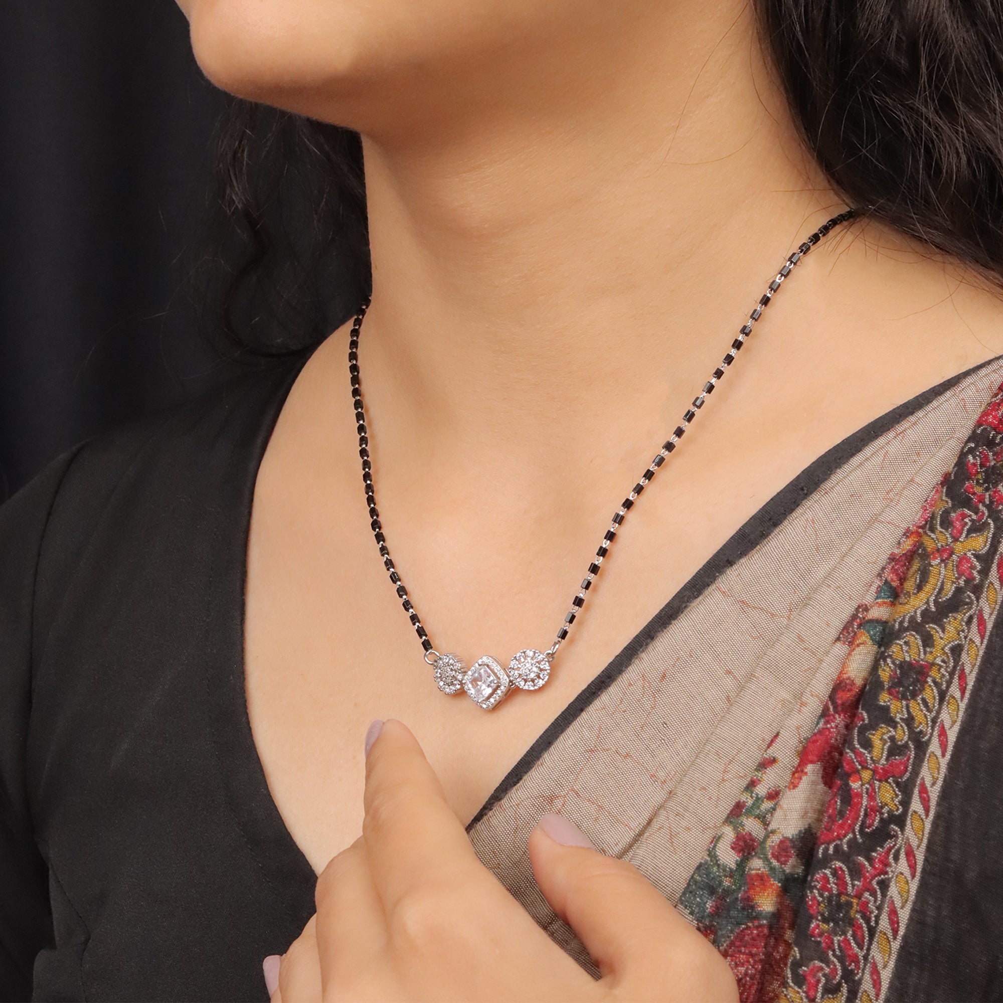 Bring grace, purity, and brilliance together with the Dual Round & Square Solitaire Mangalsutra For Women by Eri Silvers. This elegant design features a radiant center Square solitaire surrounded by a halo of CZ diamonds, flanked by two equally stunning side solitaires – creating a symbol of strength, unity, and love.