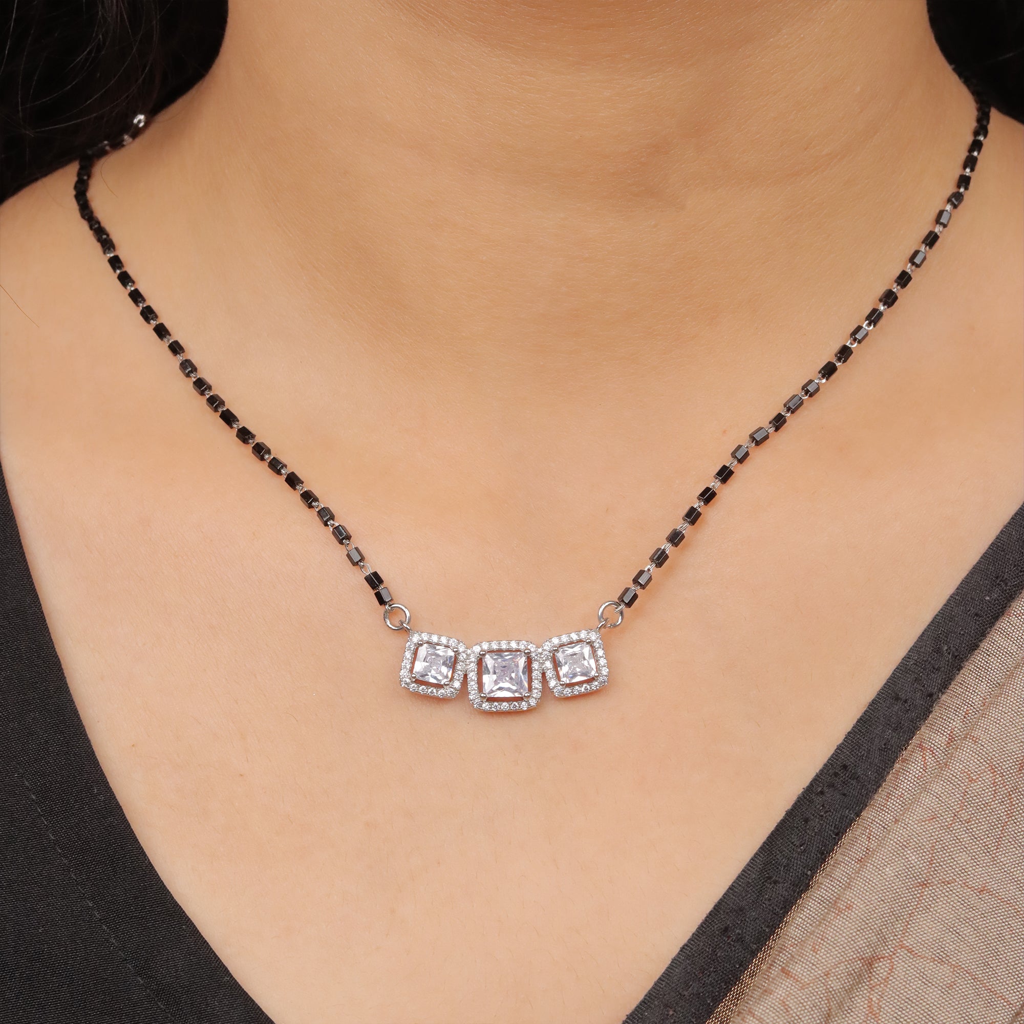 Bring elegance, brilliance, and strength together with the 92.5 Sterling Silver Triple Cushion Solitaire Mangalsutra For Women by Eri Silvers.