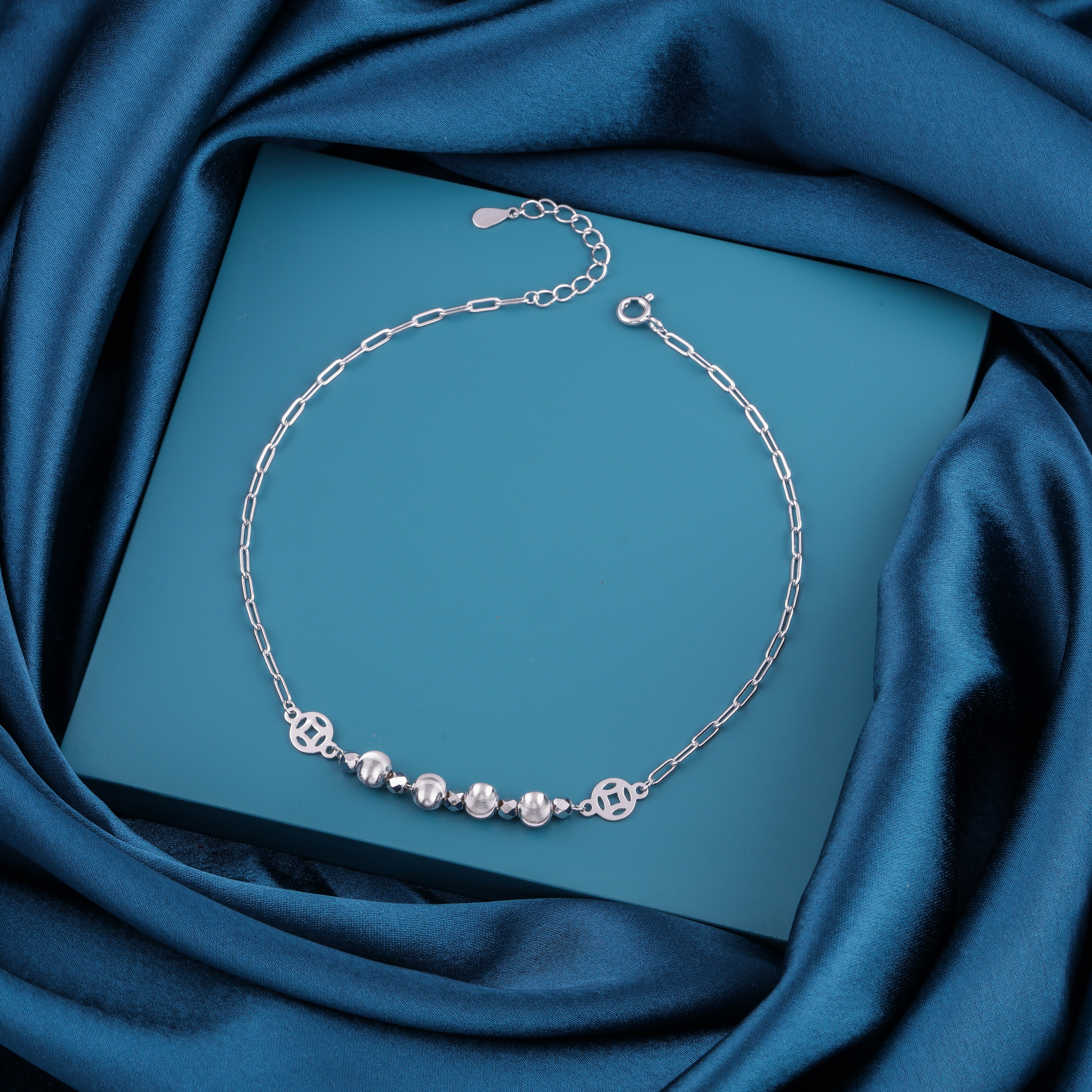 Crafted from BIS-certified 92.5 sterling silver, this anklet features five radiant silver beads set between elegant round charm links — symbolizing balance, beauty, and grace. The fine paperclip-style chain adds a modern edge, making it a versatile accessory for casual wear or special occasions.