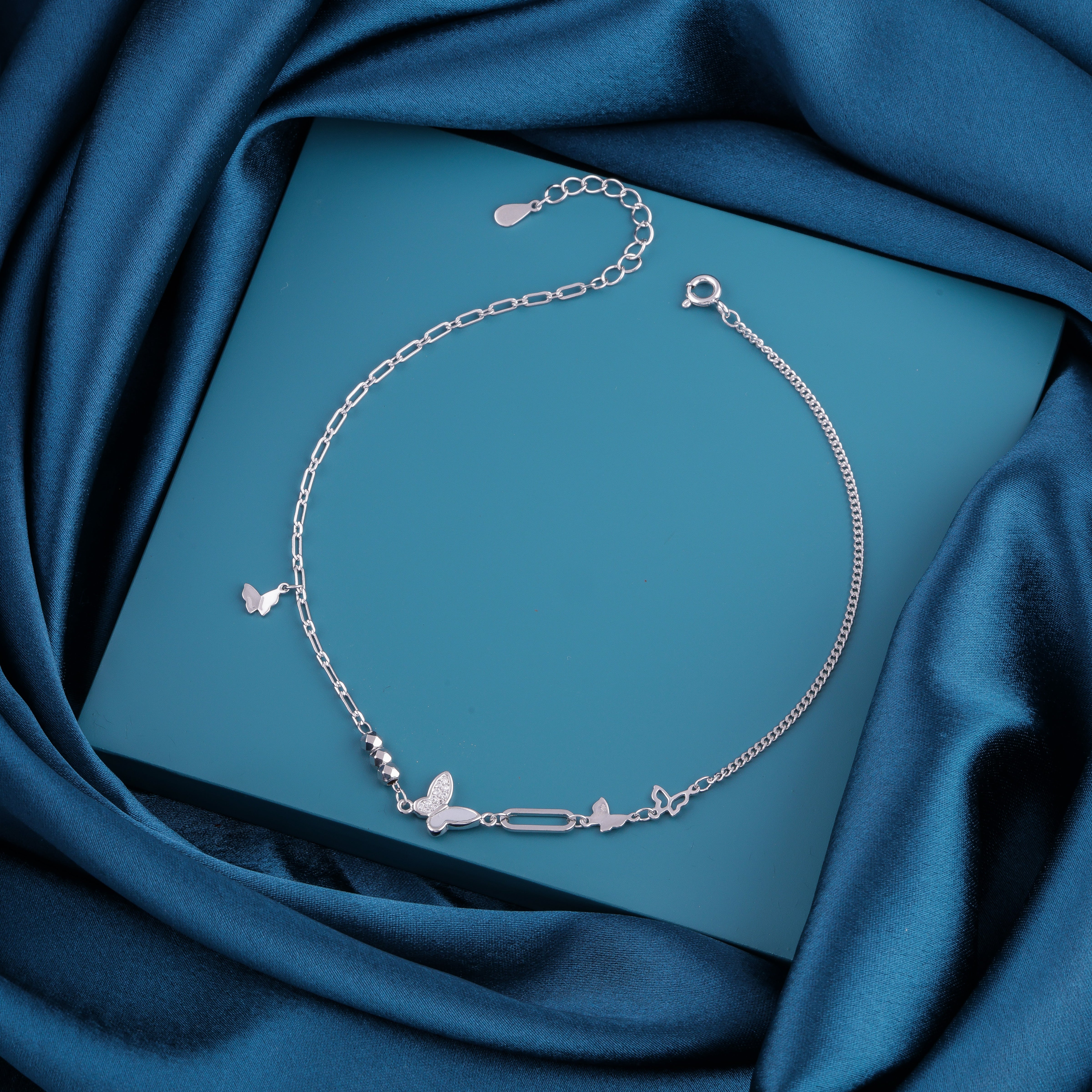 This exquisite anklet features multiple butterfly motifs along a sleek dual chain, beautifully balancing sparkle and simplicity. Each link reflects fine artistry and modern design — perfect for everyday wear or special occasions.