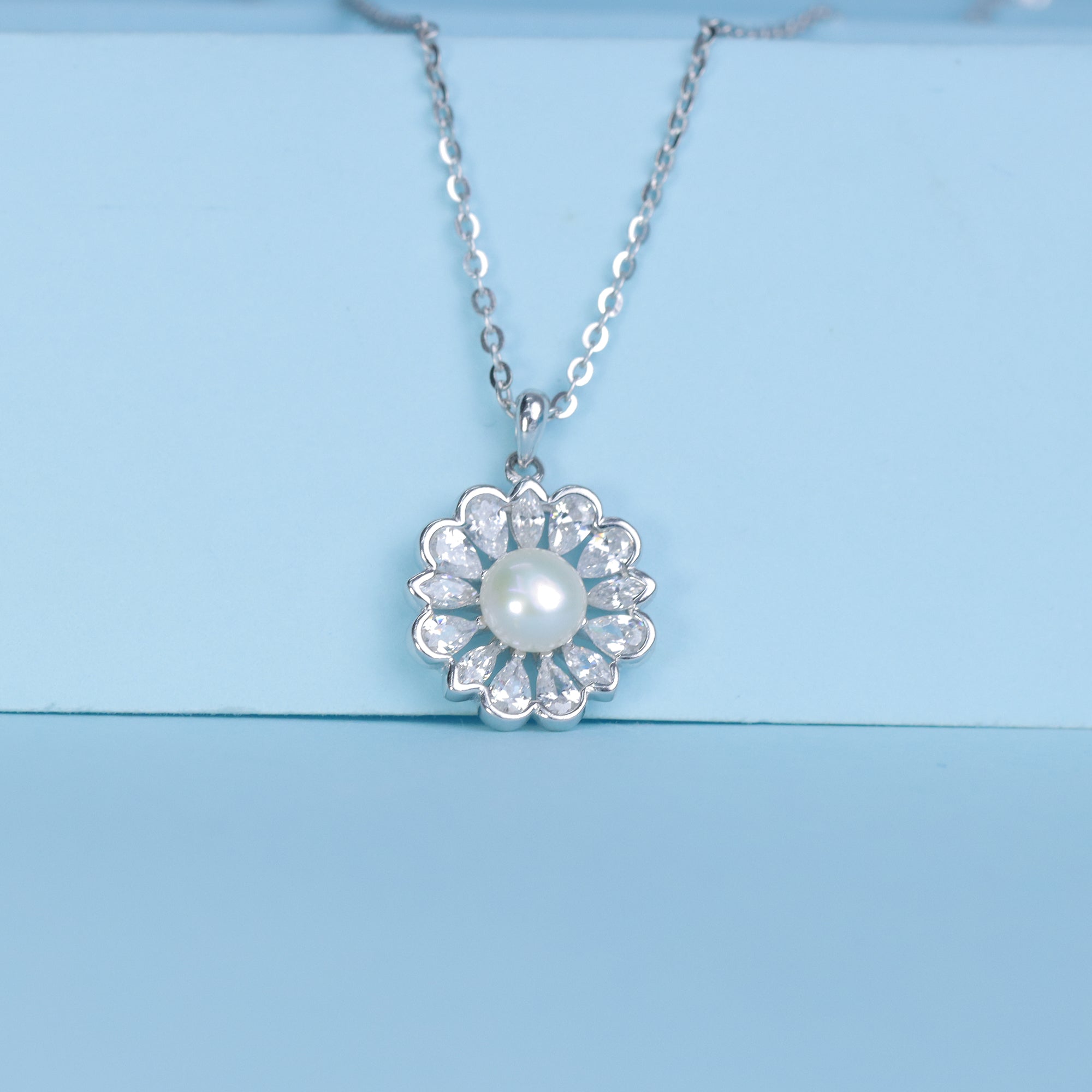 This delicate necklace showcases a flower-shaped pendant featuring a luminous pearl at the center, surrounded by sparkling AAA+ Grade Cubic Zirconia stones. The pendant is crafted from BIS Hallmarked 925 Sterling Silver, ensuring purity, durability, and lasting brilliance.