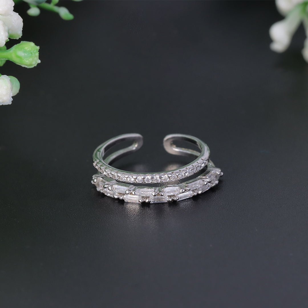 925 Sterling Silver Double Layer Baguette CZ Adjustable Ring for Women