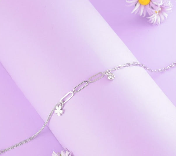 Order now and get delivery betweenAdd a touch of modern minimal elegance to your everyday style with our 925 Sterling Silver Dual Chain Flower Charm Bracelet. Designed with a chic chain-link structure, layered double-chain styling, and a delicate blue CZ flower charm, this piece is playful yet classy—perfect for stacking or wearing solo.
