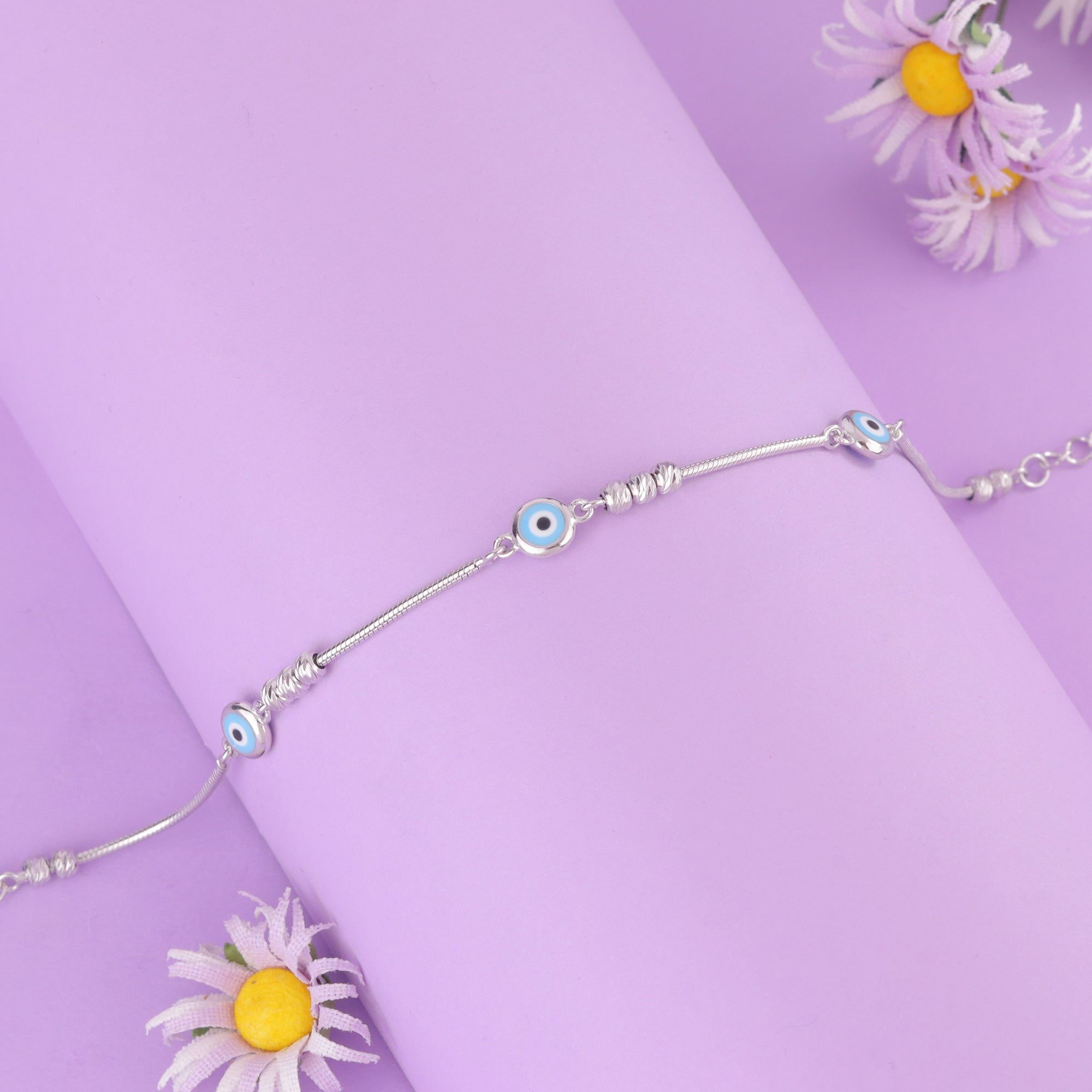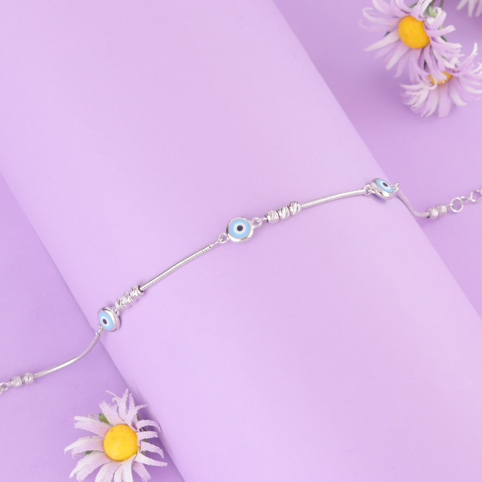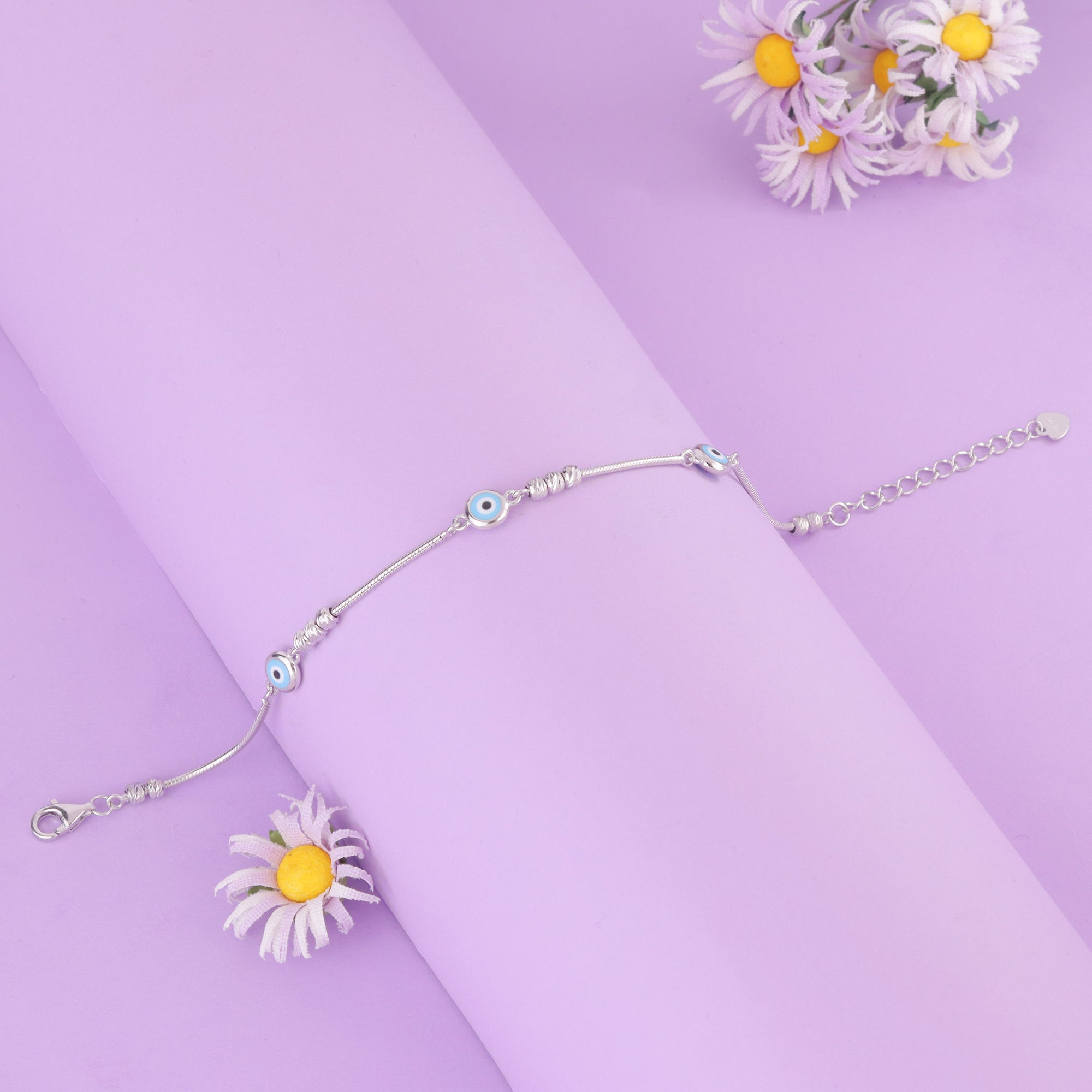 Crafted with premium BIS-Hallmarked 92.5 Sterling Silver, this bracelet features a delicate chain adorned with light blue enamel evil eye charms—symbolizing protection from negativity, bad energy, and unwanted vibes.