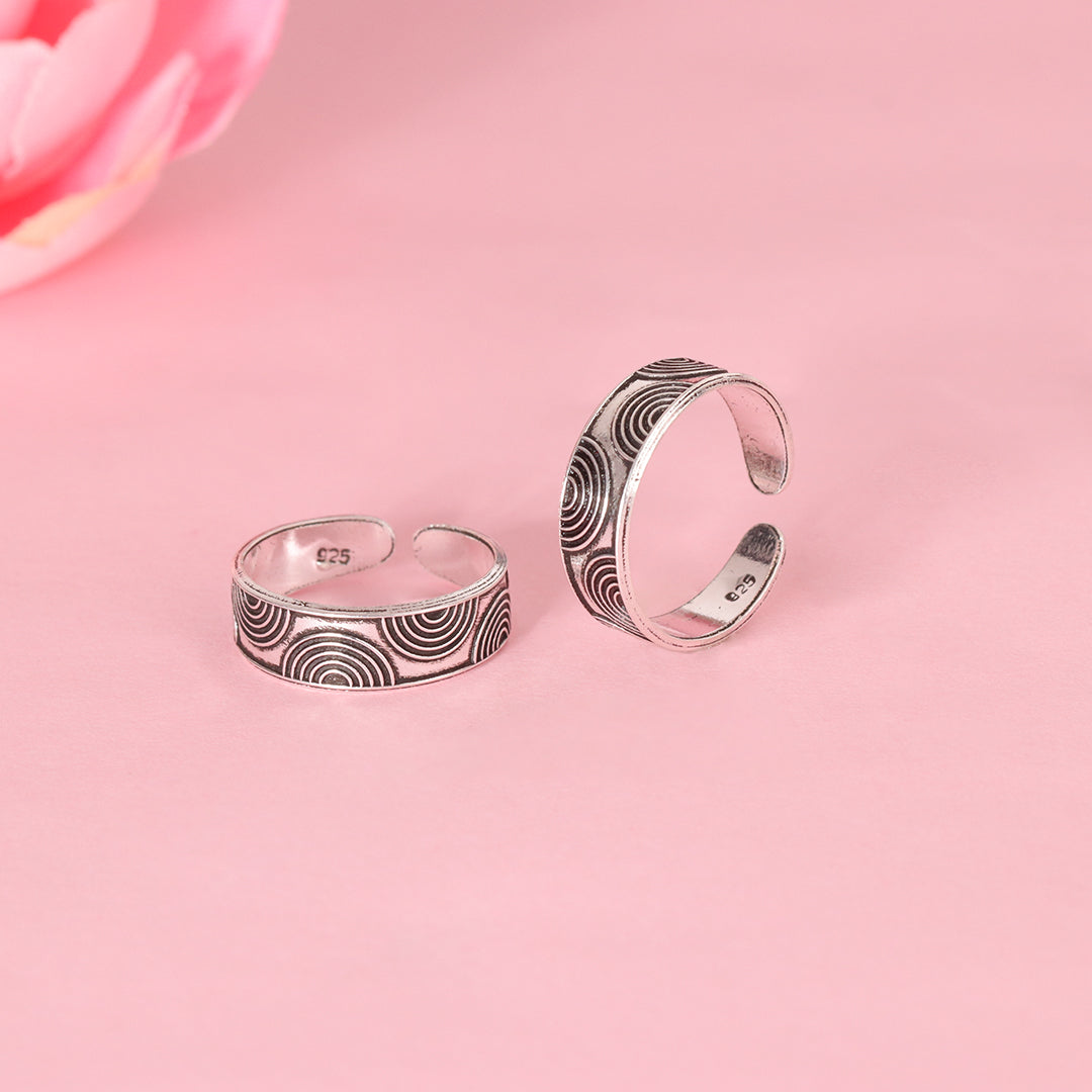 Each ring features hand-engraved concentric circles symbolizing unity and balance, meticulously carved on a BIS-certified 92.5% sterling silver band. The oxidized finish enhances its intricate detailing, giving it a vintage yet timeless appeal perfect for everyday wear or festive occasions.