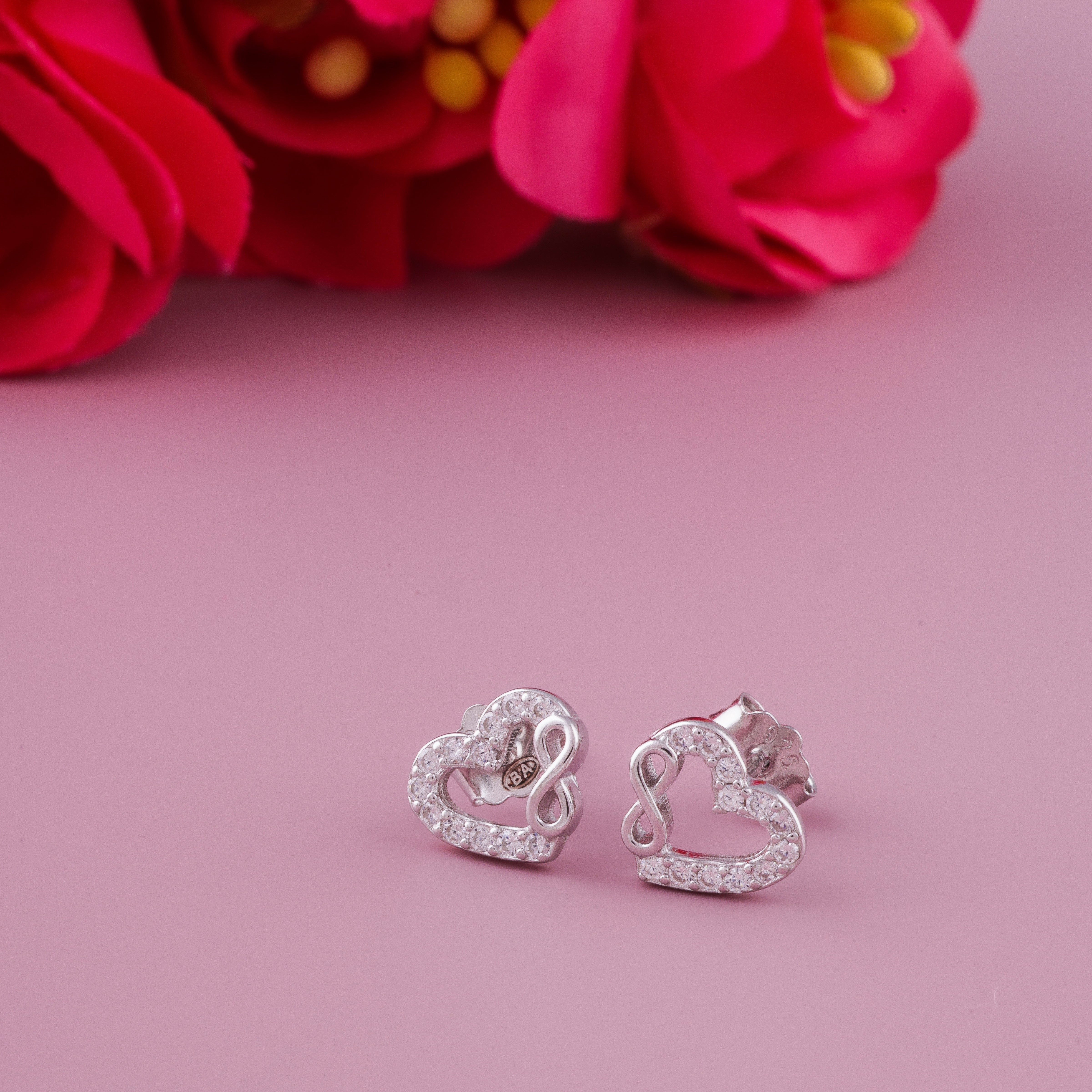 Expertly crafted from BIS Hallmarked 92.5 sterling silver, these earrings feature a delicate heart intertwined with an infinity symbol, encrusted with dazzling cubic zirconia stones that shimmer with every movement.