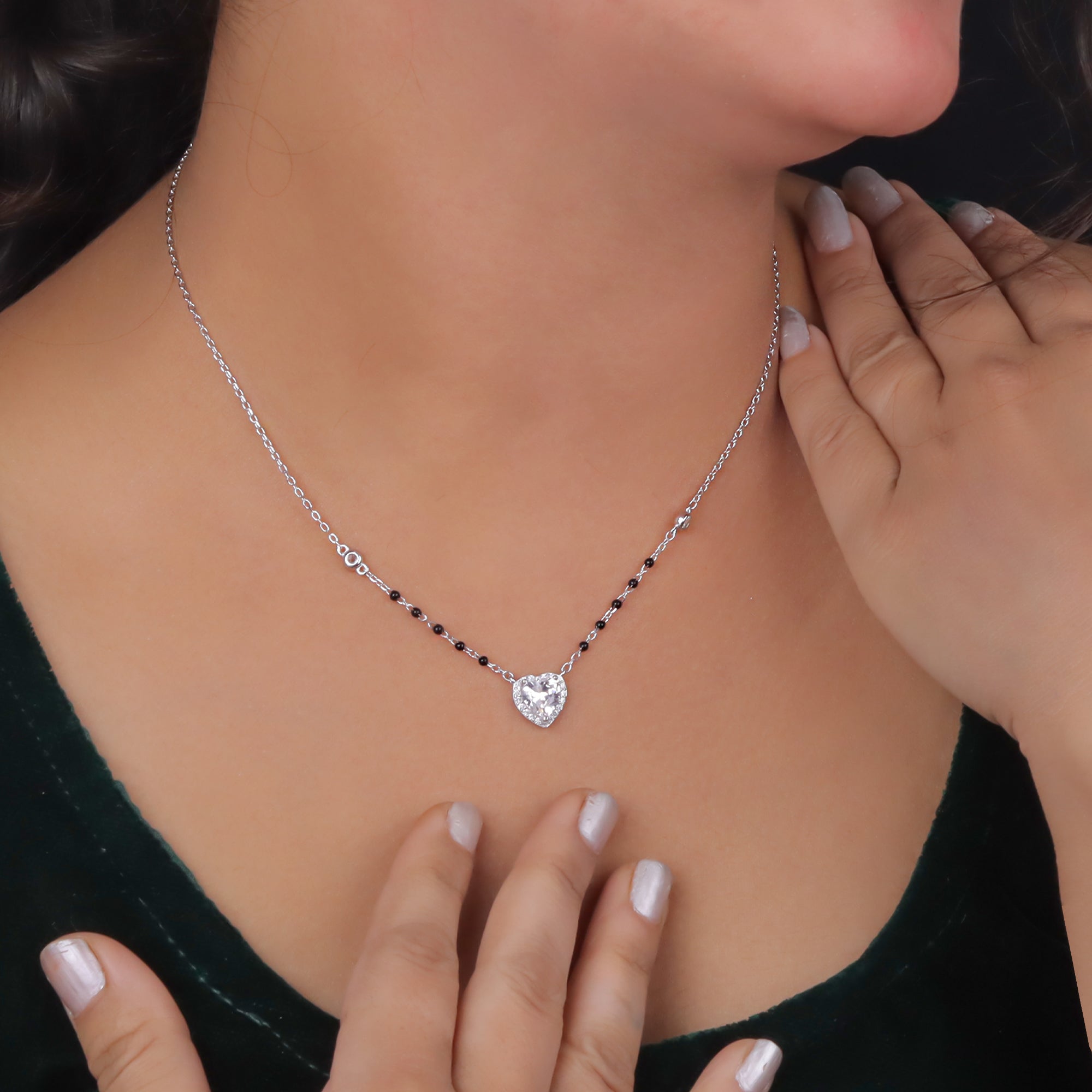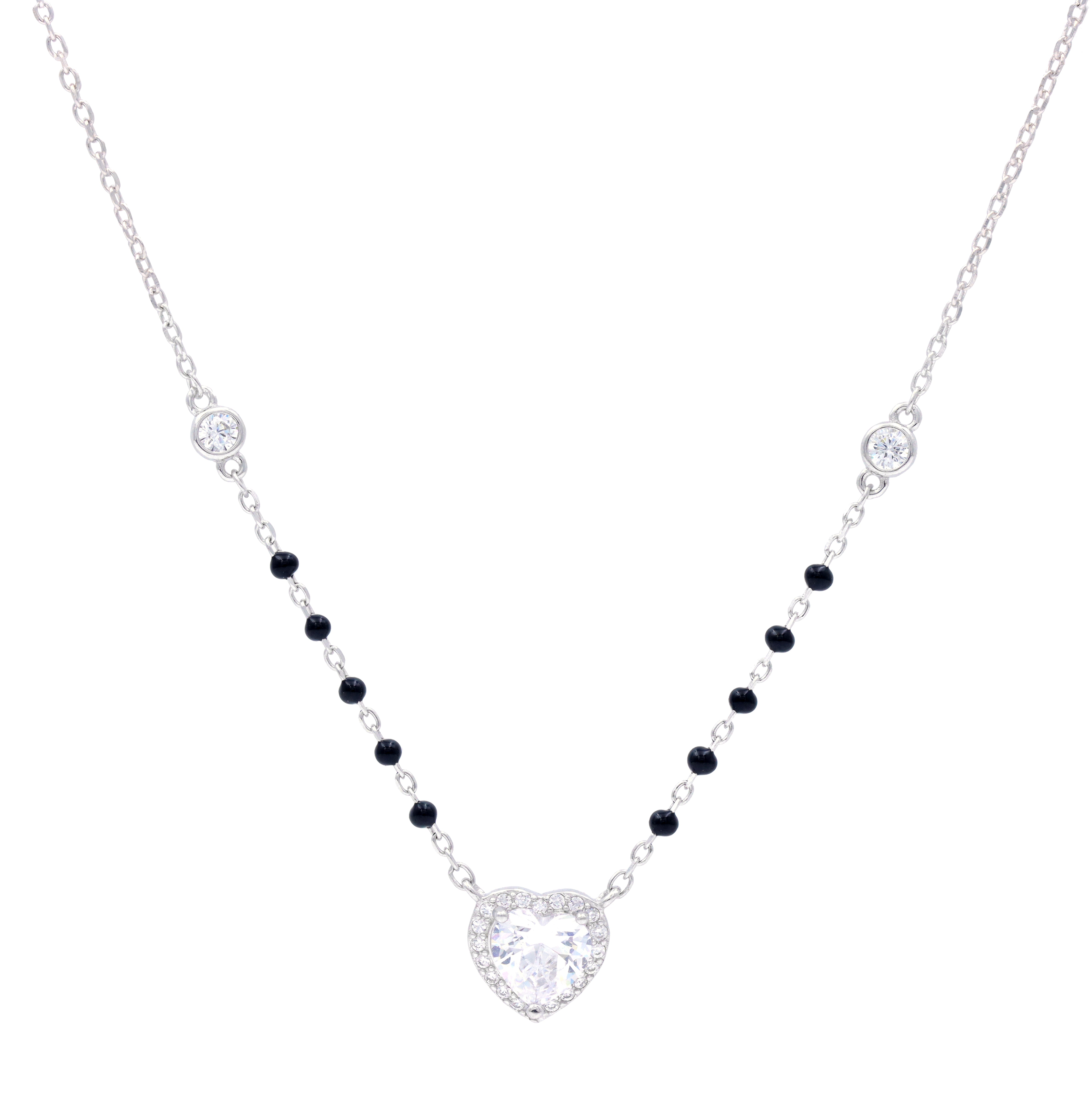 Order now and get delivery betweenCelebrate timeless love and elegance with the Sterling Silver Heart-Shaped Solitaire Mangalsutra from Eri Silvers. Crafted from premium 925 sterling silver, this piece features a dazzling heart-cut solitaire CZ diamond surrounded by sparkling mini stones, paired with a delicate black bead chain symbolizing eternal bond and protection.