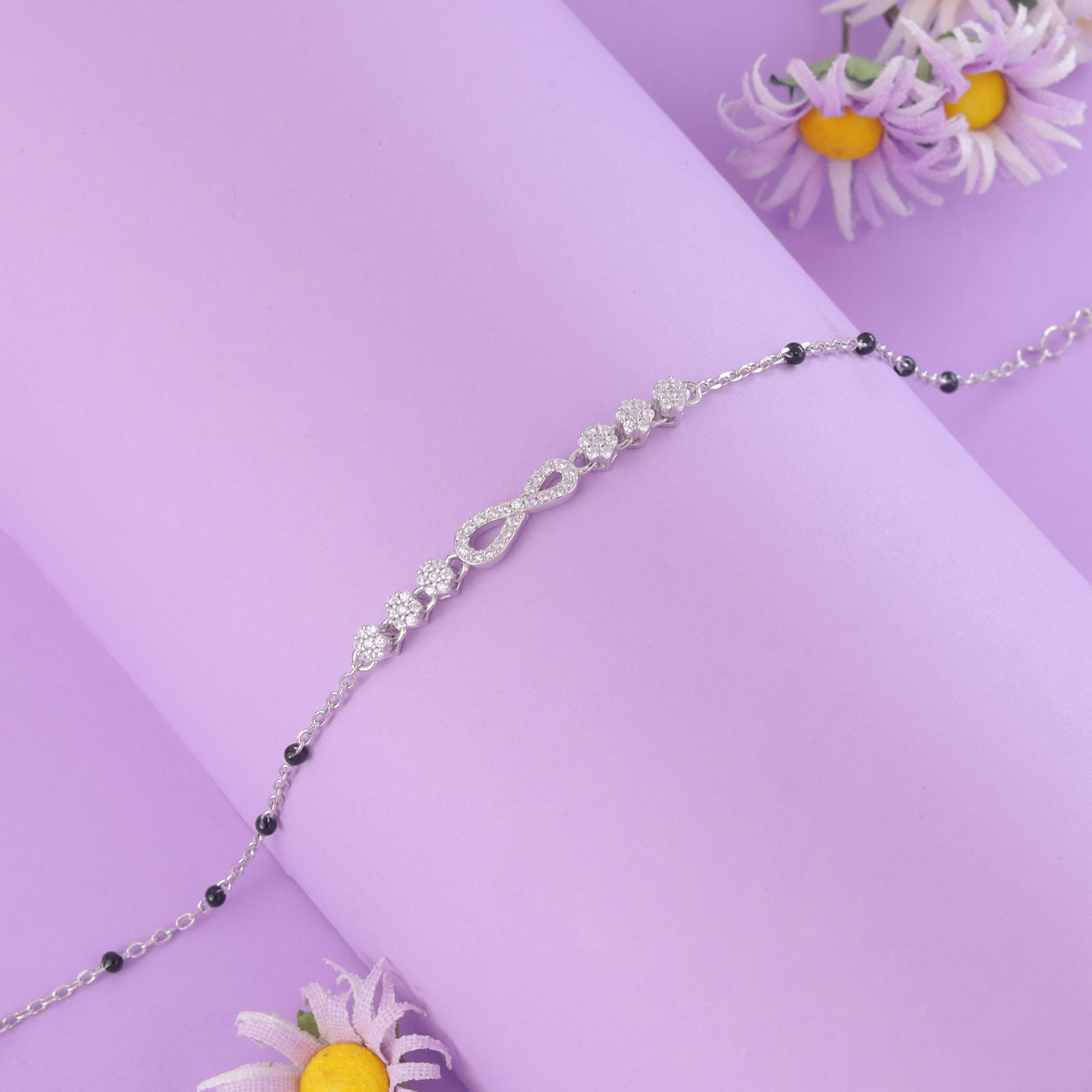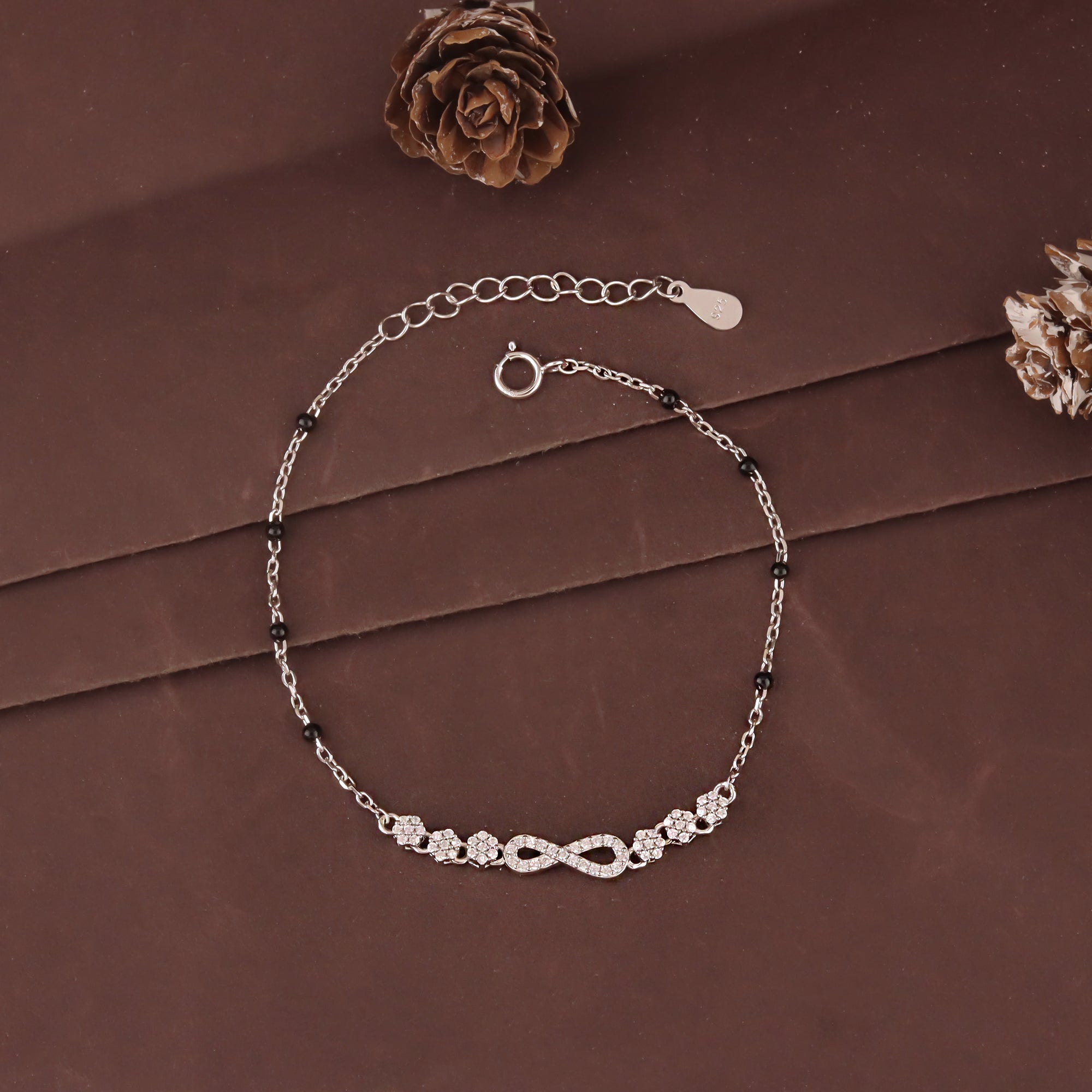 Order now and get delivery betweenIntroducing the Infinity Floral Mangalsutra Bracelet in 925 Sterling Silver, designed for women who appreciate modern elegance and traditional symbolism. This bracelet features a stunning infinity symbol, surrounded by micro-paved CZ floral clusters, paired with a delicate chain adorned with signature black mangalsutra beads.