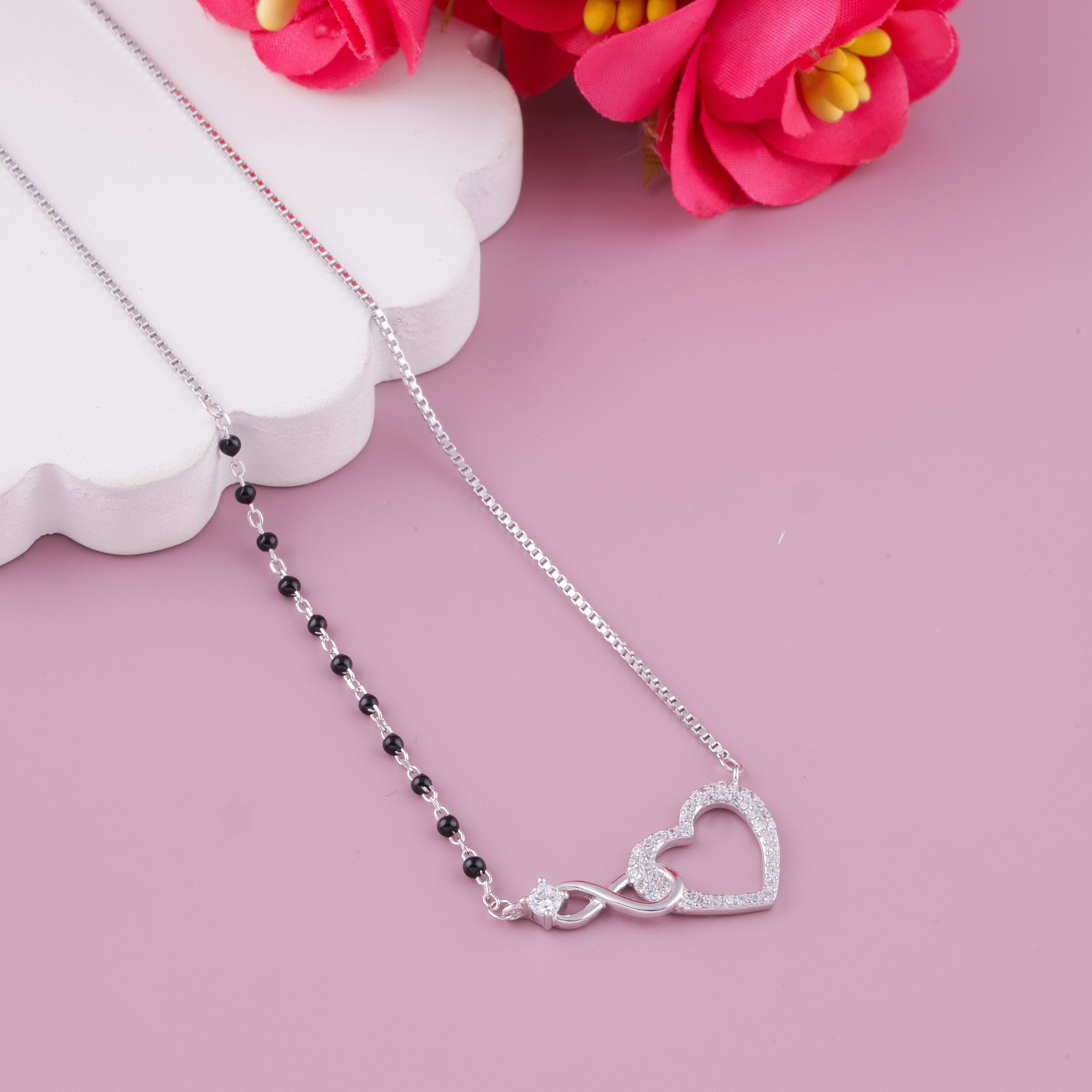 This delicate design beautifully blends the symbol of infinity and heart, representing everlasting commitment and unity. Handcrafted in pure BIS-certified 92.5 sterling silver, it features a sparkling CZ diamond-studded pendant paired with a graceful half black-bead and half silver chain, adding a modern touch to a traditional symbol.