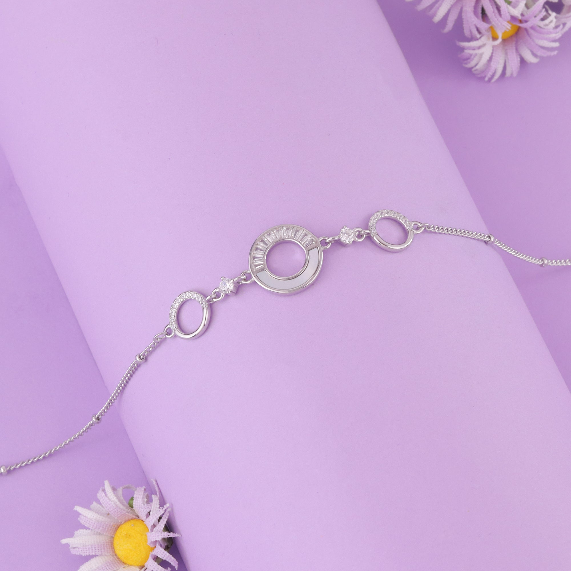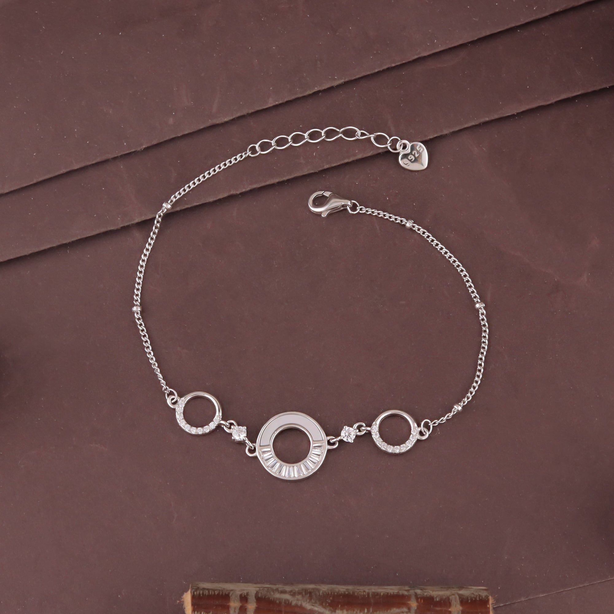 This exquisite bracelet showcases a minimalist multi-circle design, beautifully enhanced with sparkling AAA+ round and baguette-cut Cubic Zirconia stones.