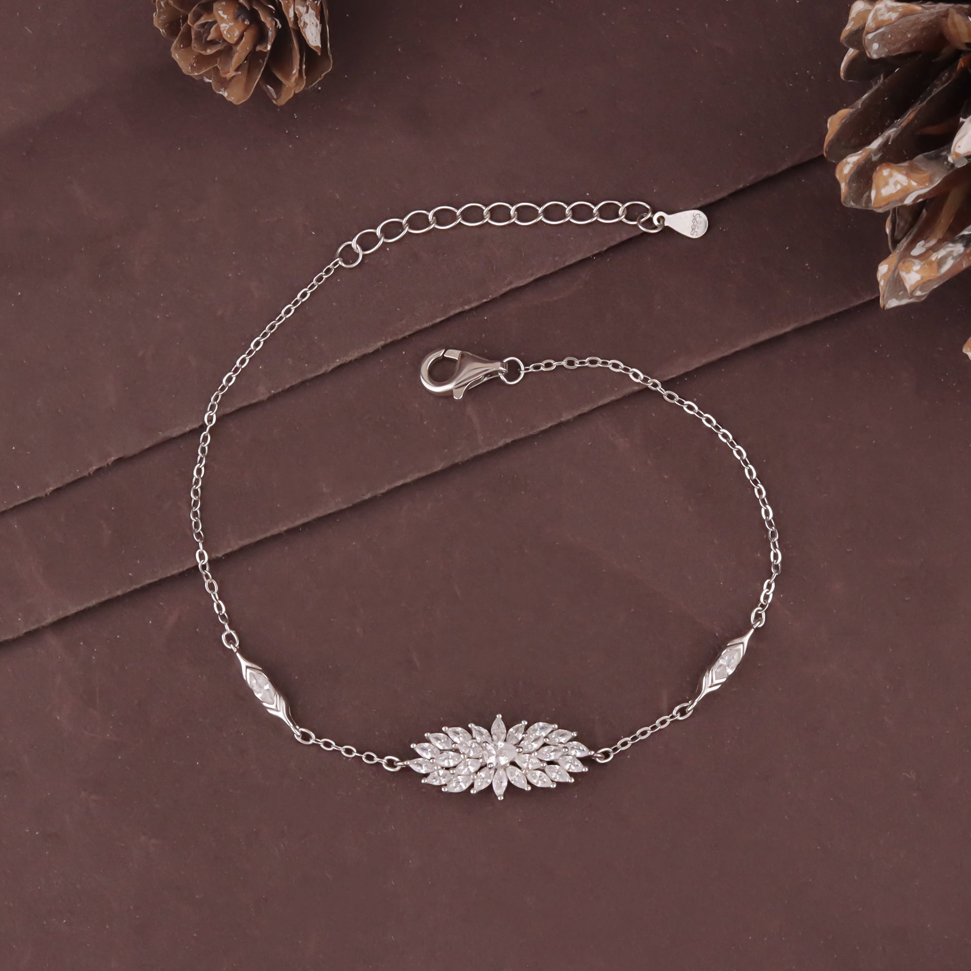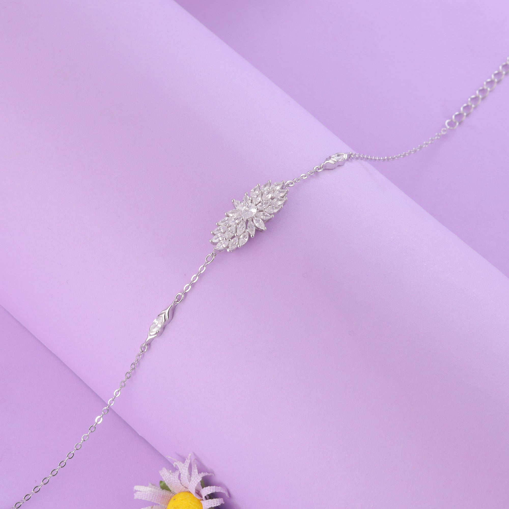 Made from BIS Hallmarked 92.5 sterling silver, this bracelet features a sparkling leaf-inspired CZ cluster centerpiece, symbolizing growth, beauty, and new beginnings.