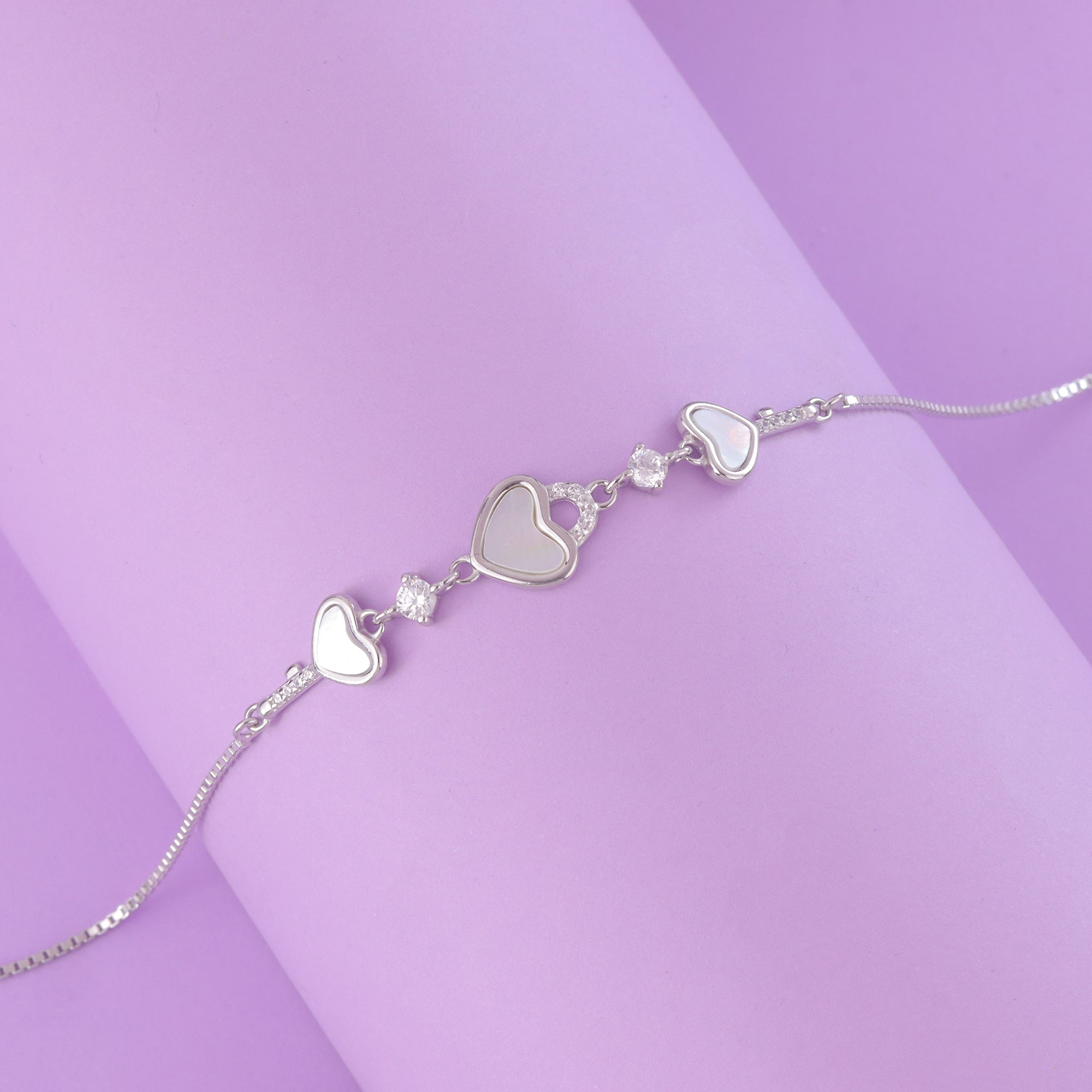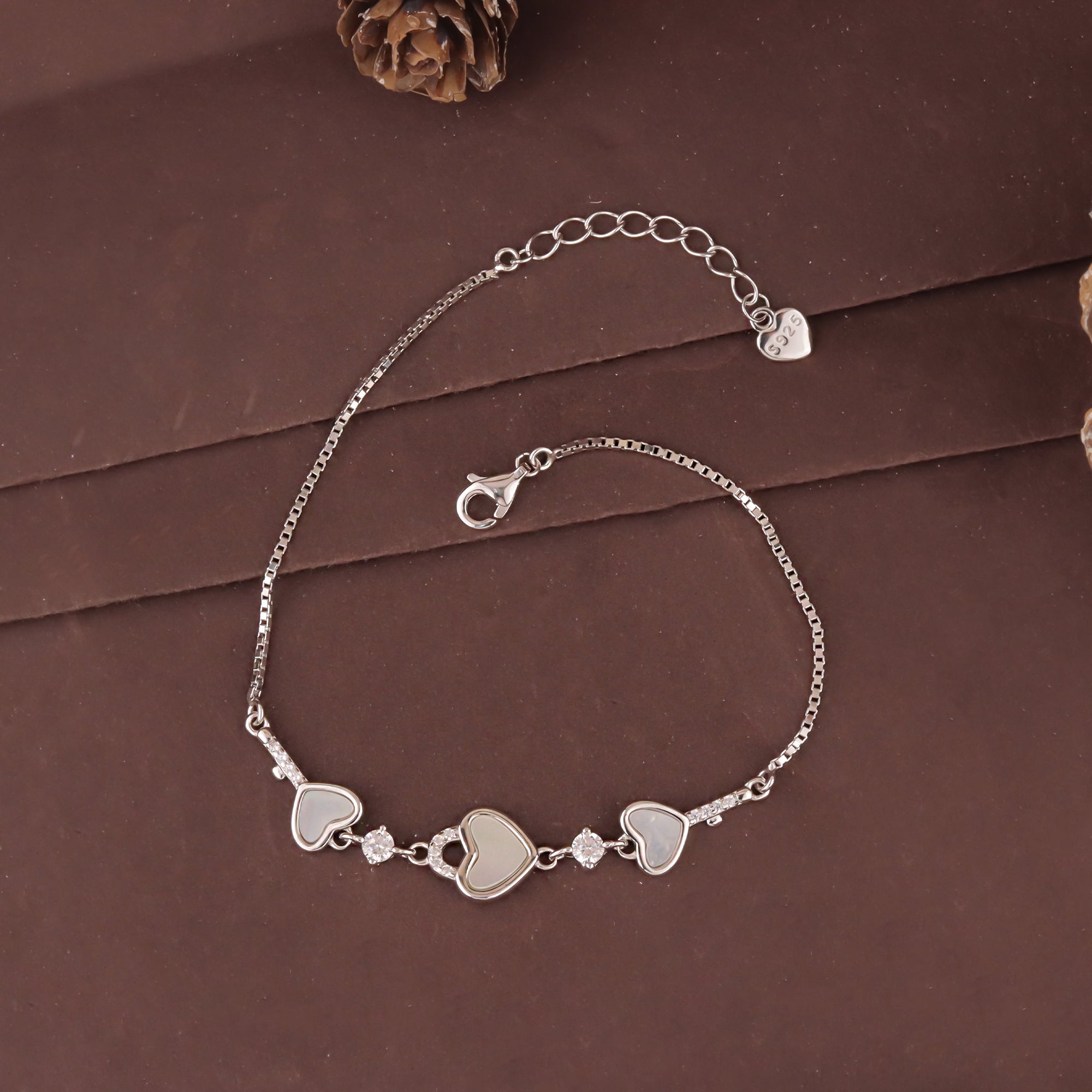 Designed with three beautifully crafted heart charms made from genuine Mother of Pearl, paired with sparkling AAA+ Cubic Zirconia stones, this bracelet blends sophistication with a soft, romantic aesthetic.