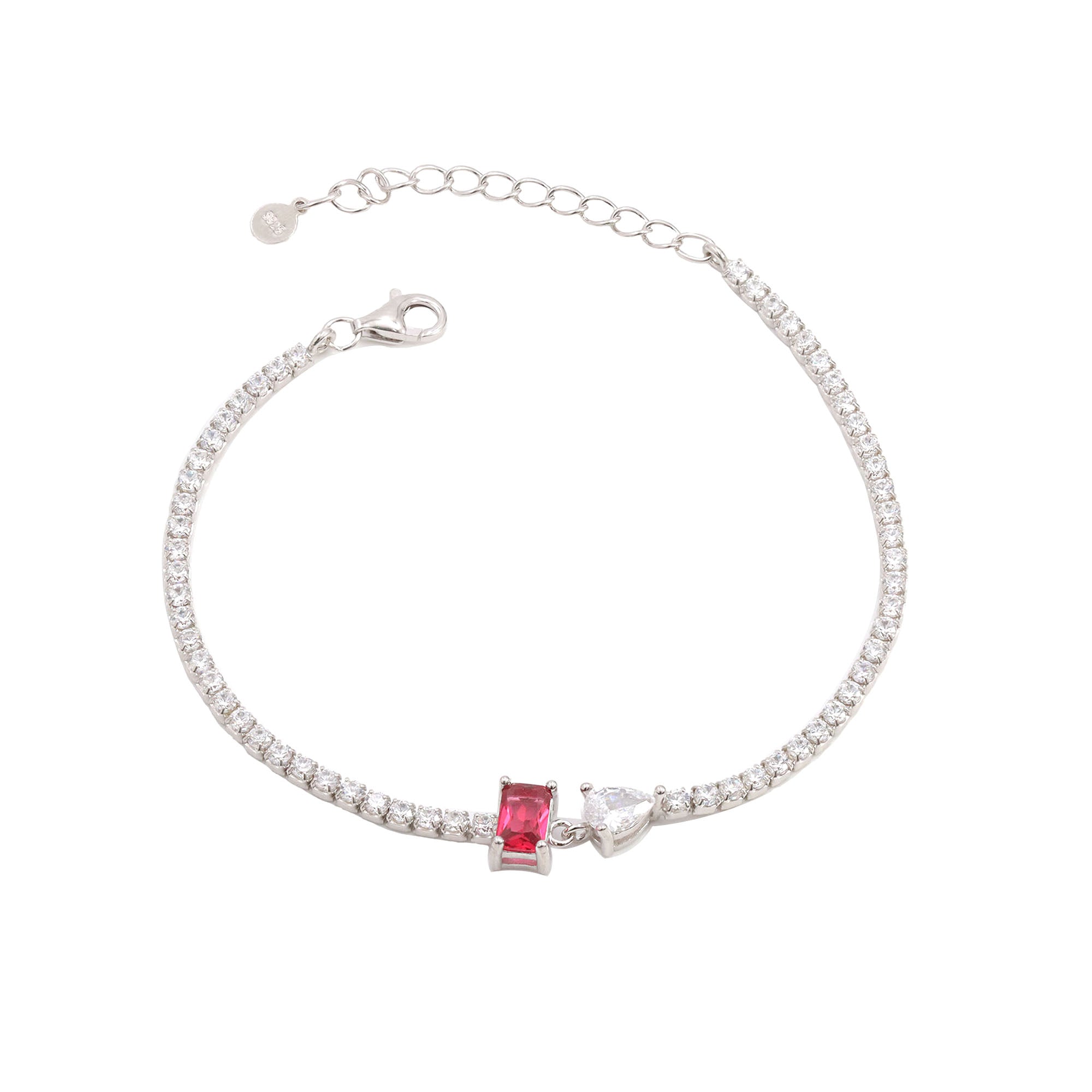 This bracelet features a full line of AAA+ zircon stones, arranged in a classic tennis layout, enhanced by a striking pink pear-cut solitaire at the center—symbolizing love, tenderness, and confidence.