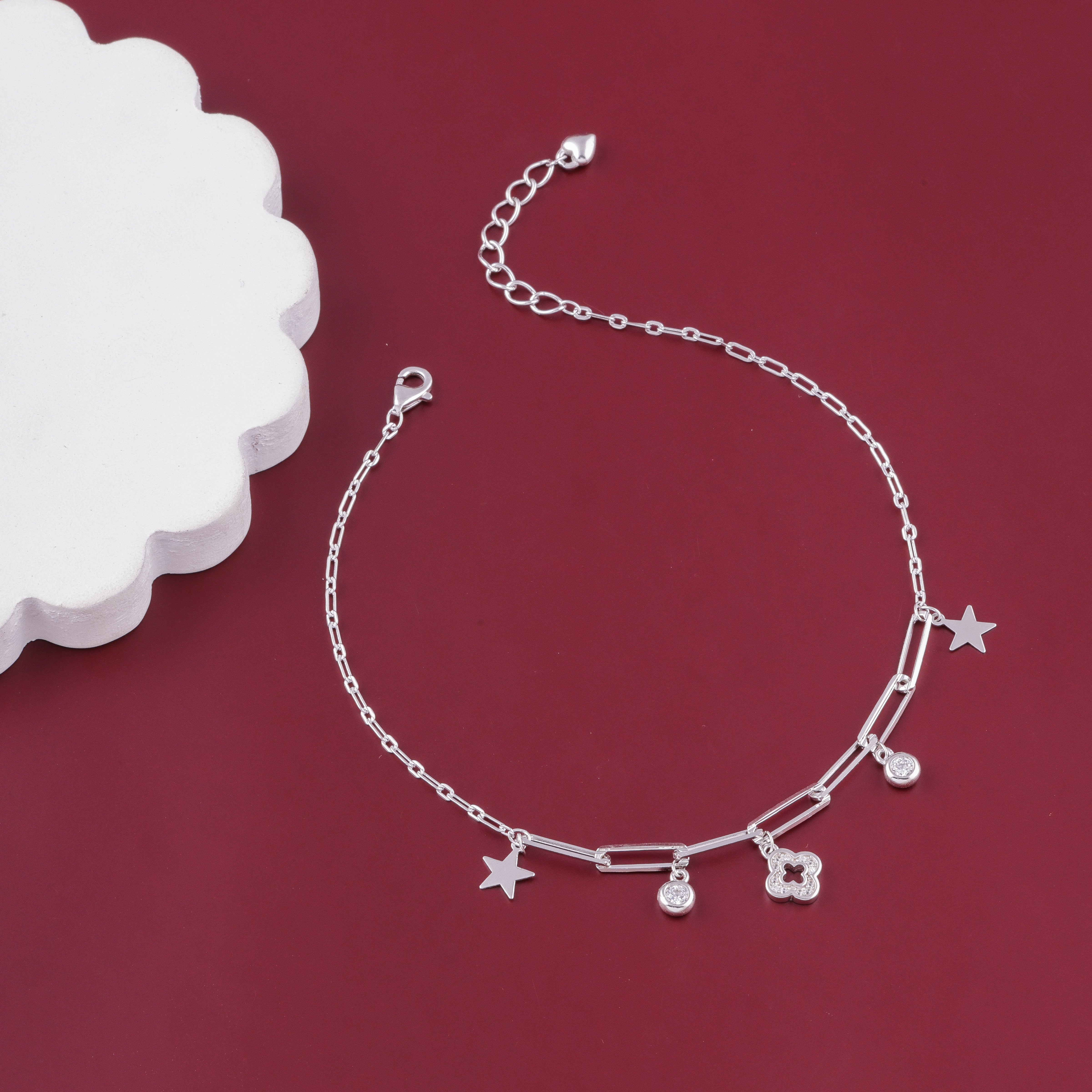 Shine with celestial elegance wearing the Eri Silvers 925 Sterling Silver Star & Floral Charm Anklet — a stunning fusion of modern design and timeless craftsmanship.