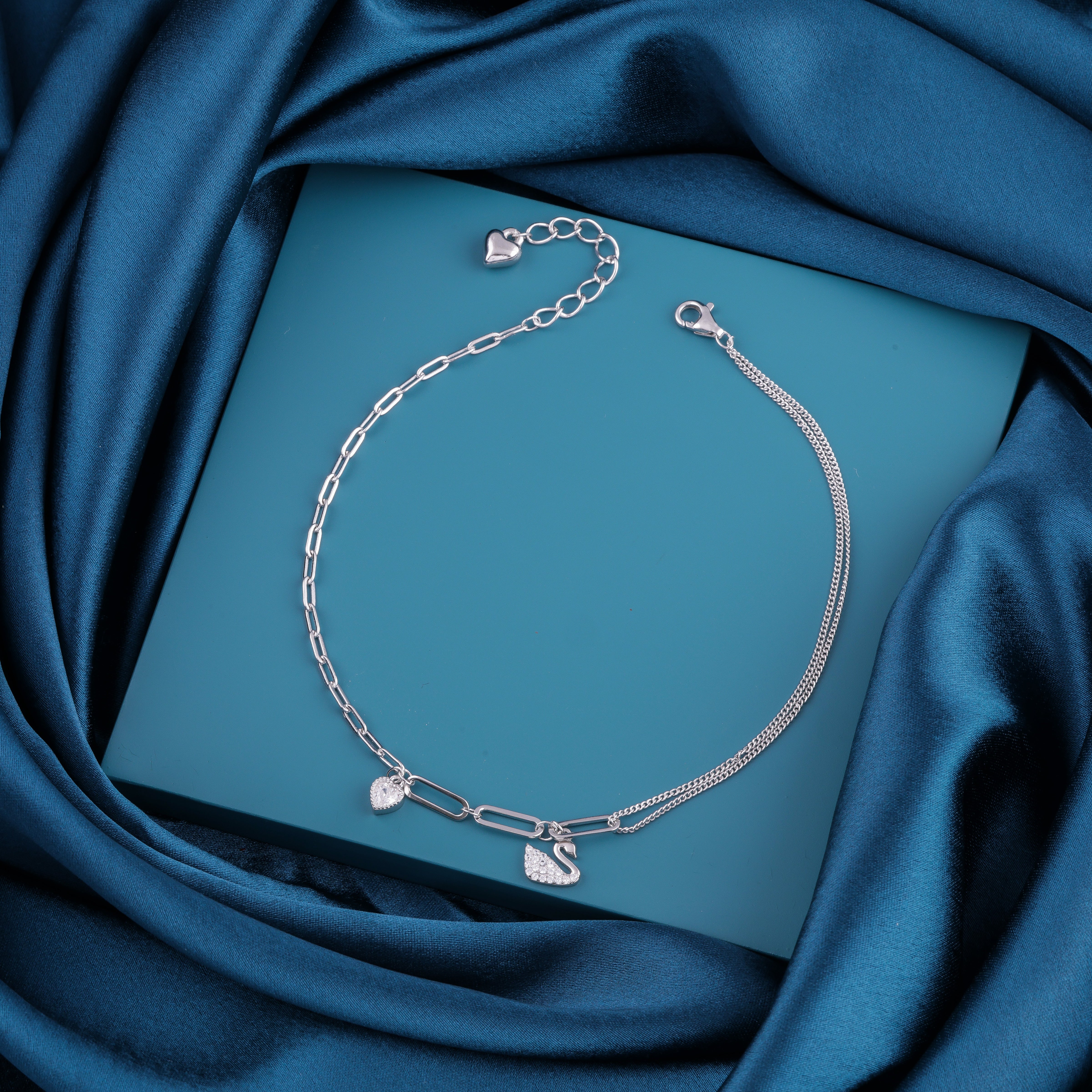 This stunning anklet features a delicate dual-chain design, accentuated by a sparkling swan charm and a dainty heart pendant — perfect for expressing grace and affection.