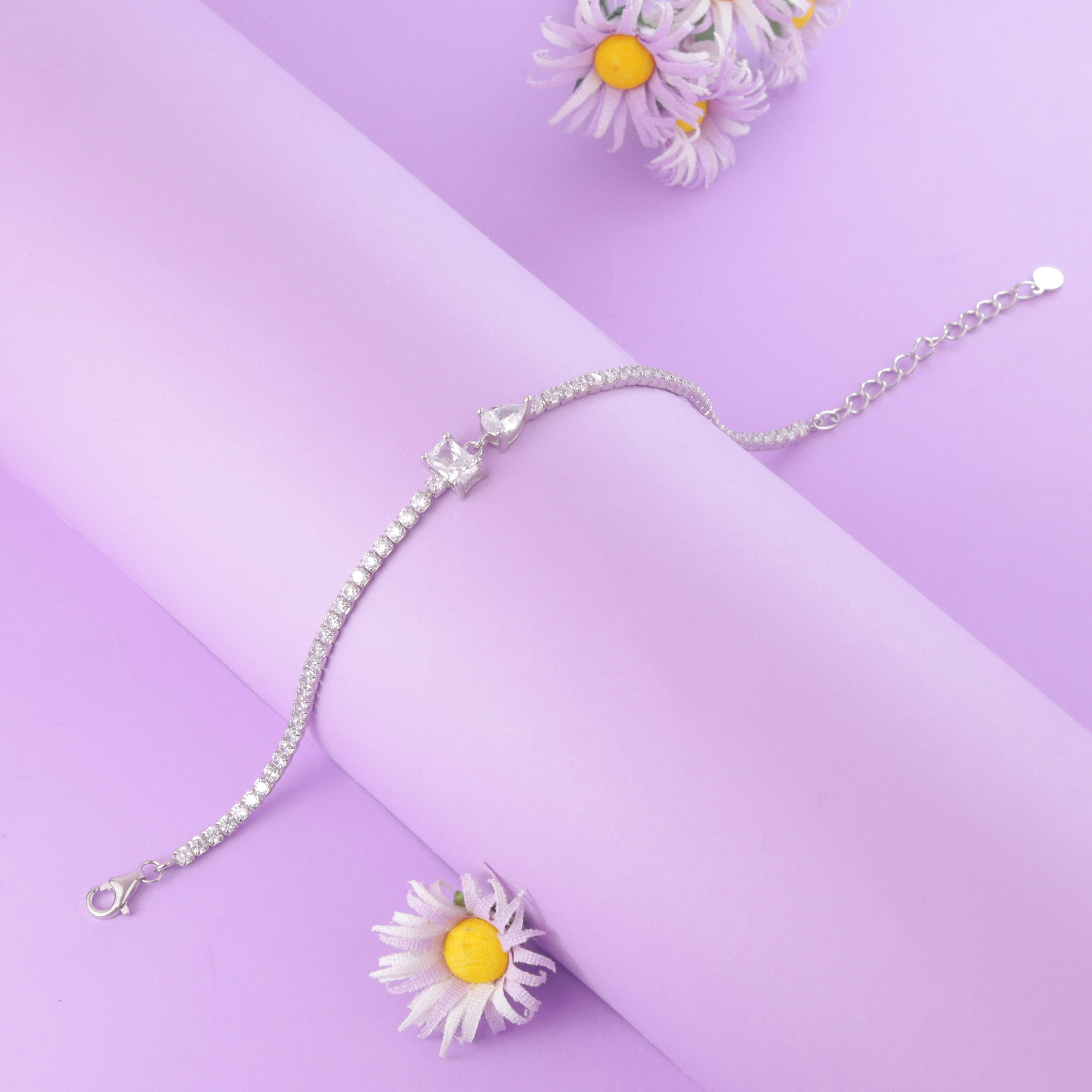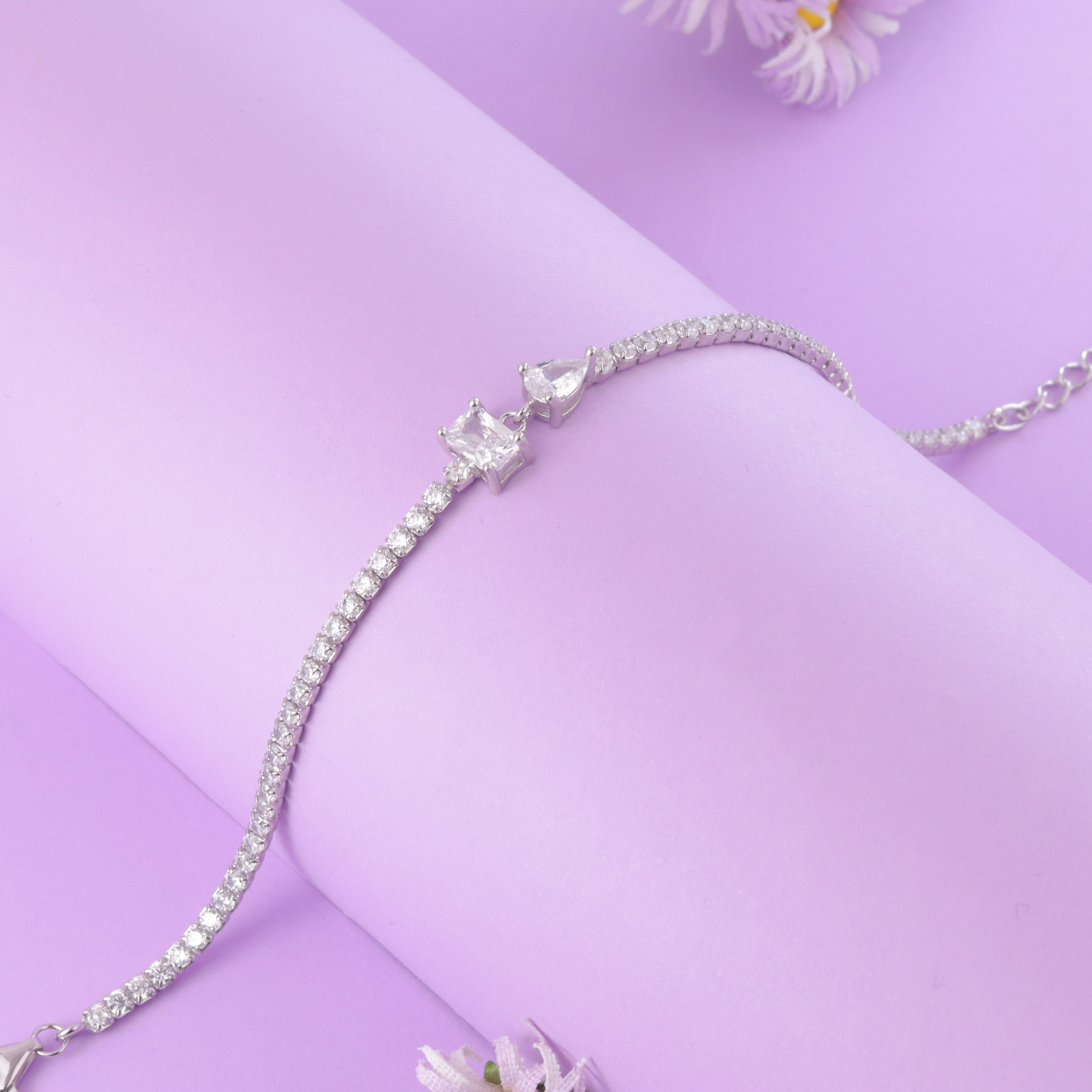 Order now and get delivery betweenour elegant white stone sterling silver tennis bracelet with pear & princess cut charm. BIS certified, hypoallergenic & perfect for gifting. Only at Eri Silvers.