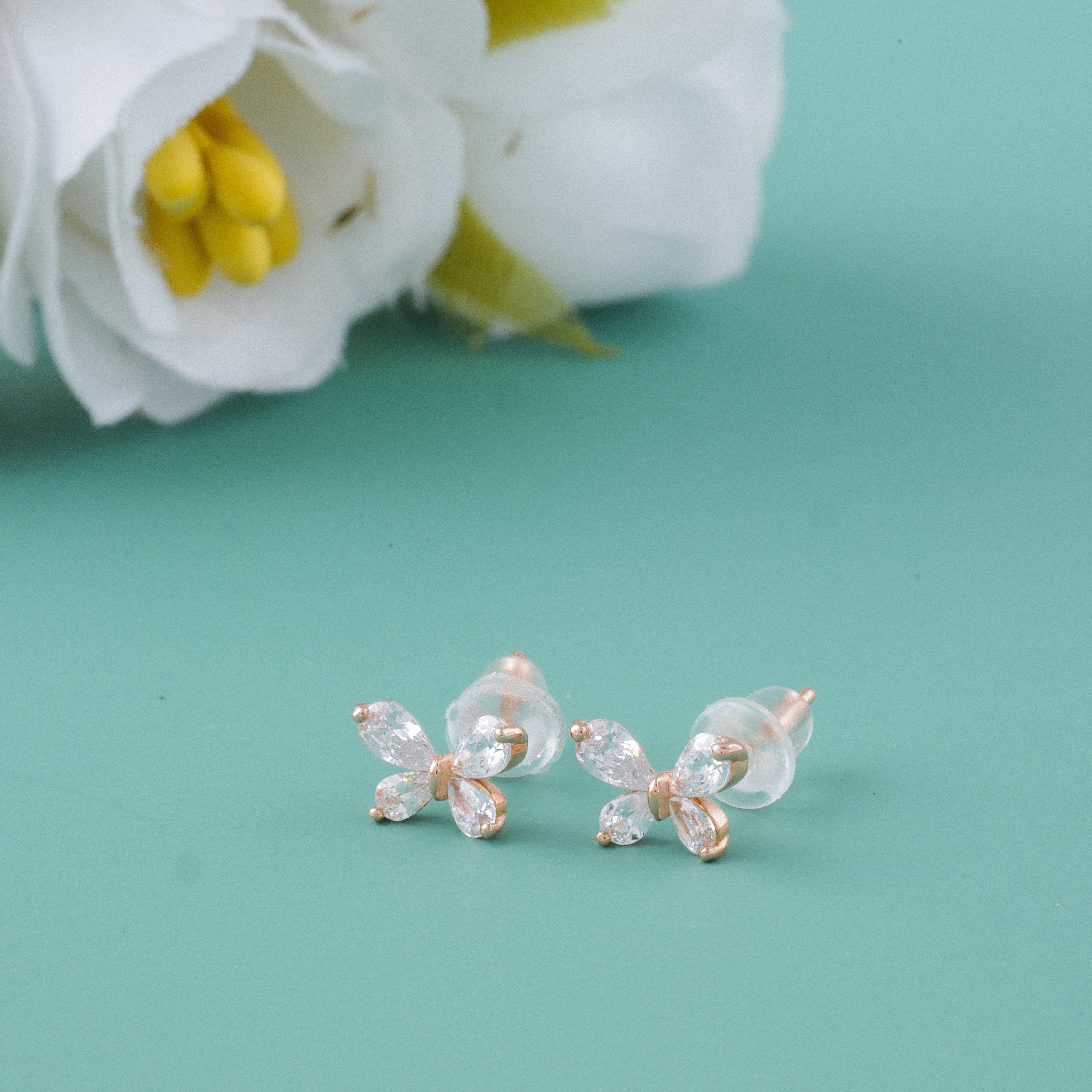 Embrace delicate beauty with the Butterfly 92.5Rose Gold Plated Silver Earrings For Women by Eri Silvers. These stunning earrings feature an elegant butterfly design adorned with brilliant-cut cubic zirconia stones that capture light beautifully.