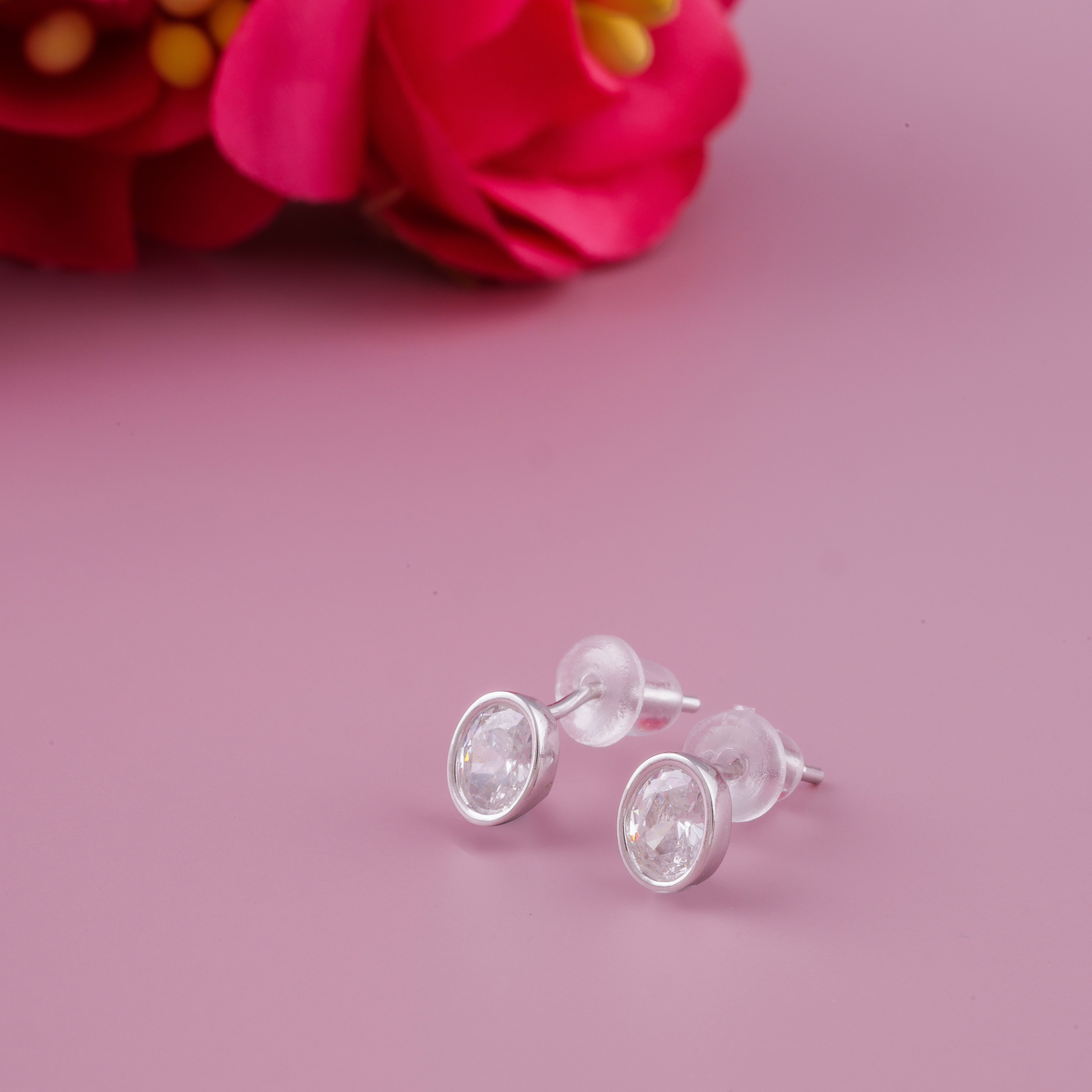 The sleek bezel setting adds modern refinement, while the rhodium-plated finish ensures long-lasting shine and resistance to tarnish. Lightweight, comfortable, and hypoallergenic — these studs are perfect for daily wear or as a thoughtful gift.