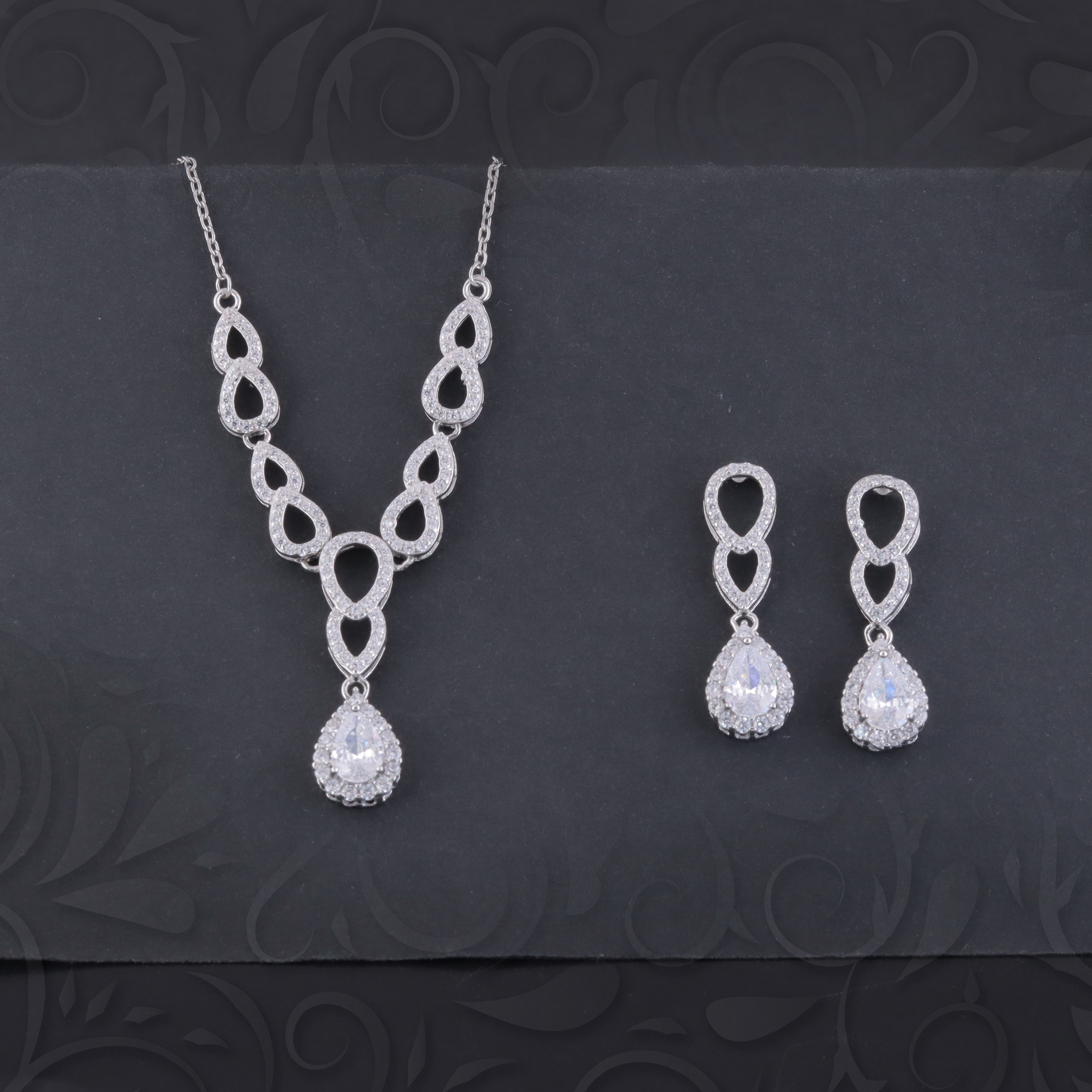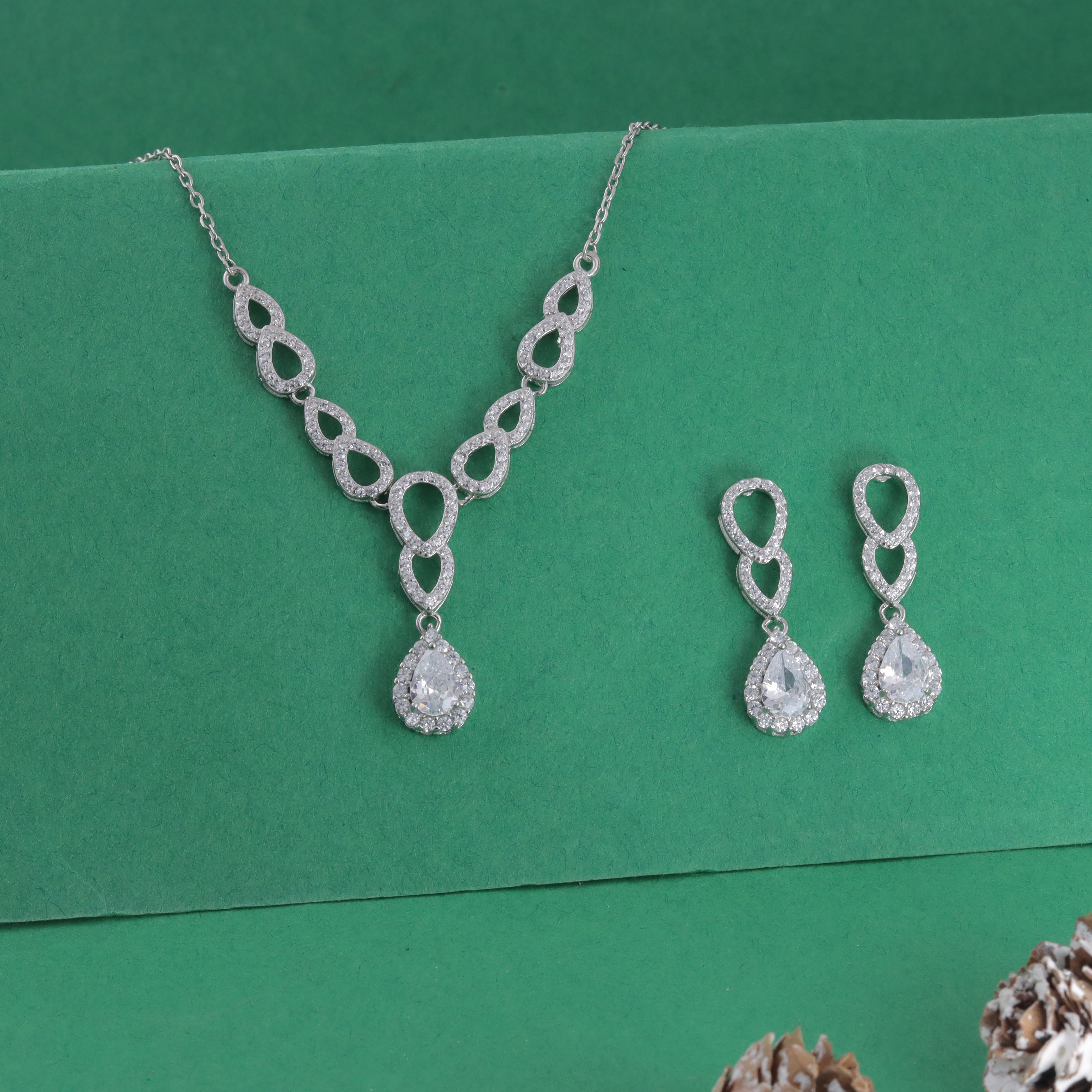Order now and get delivery betweenShine with timeless grace in the Eri Silvers Infinity Glow Necklace & Earrings Set, a symbol of elegance and endless beauty. Expertly crafted from BIS-certified 925 sterling silver, this exquisite set features interlinked infinity motifs adorned with sparkling teardrop cubic zirconia stones, designed to catch every glimmer of light.