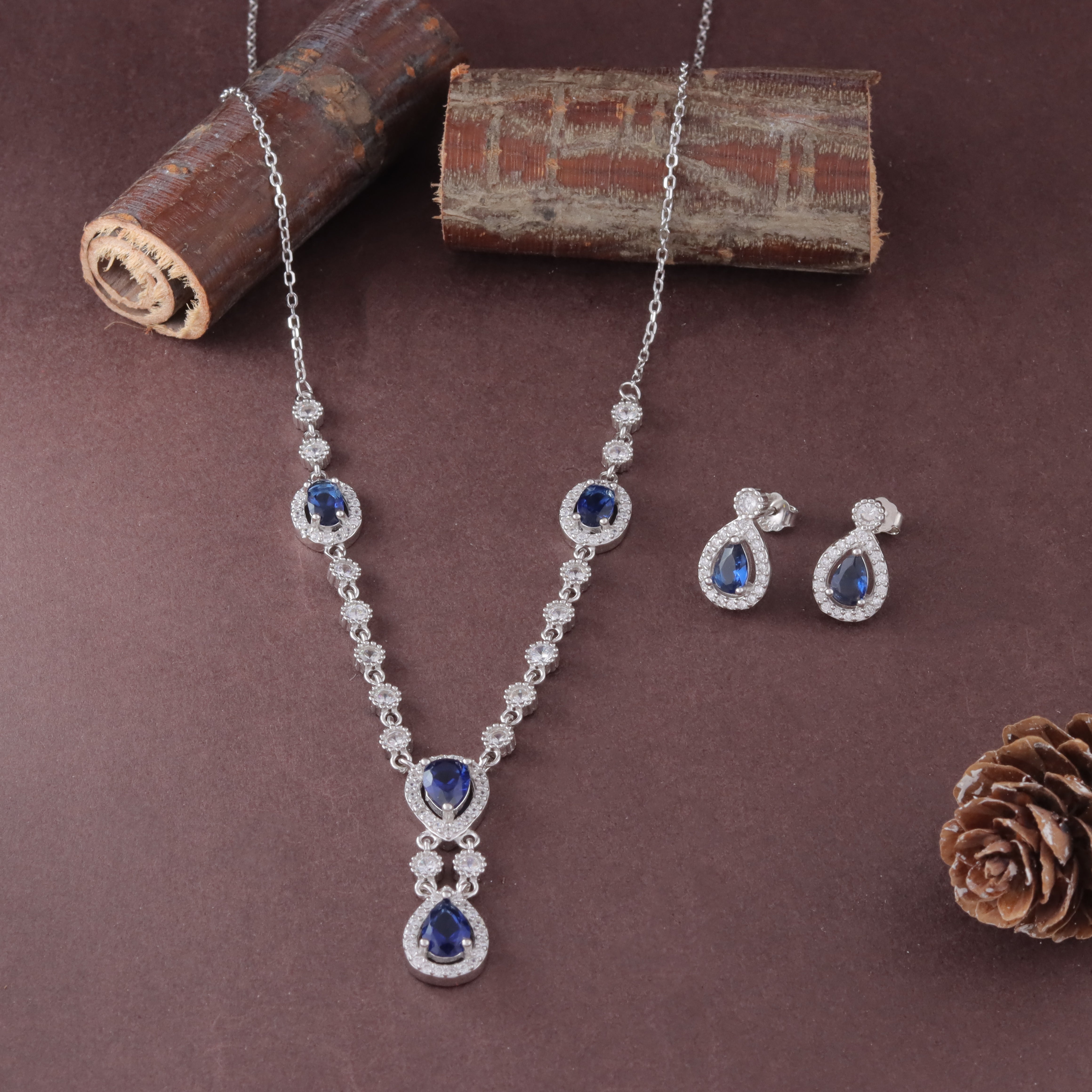 Add a touch of timeless elegance to your look with the Eri Silvers Sapphire Sparkle Necklace & Earring Set. Crafted from 925 sterling silver and adorned with deep blue sapphire-inspired stones, this graceful design celebrates sophistication and style. Each piece is BIS-certified, ensuring purity and authenticity you can trust. Whether it’s a romantic dinner, festive celebration, or an everyday sparkle, this set complements every moment beautifully.