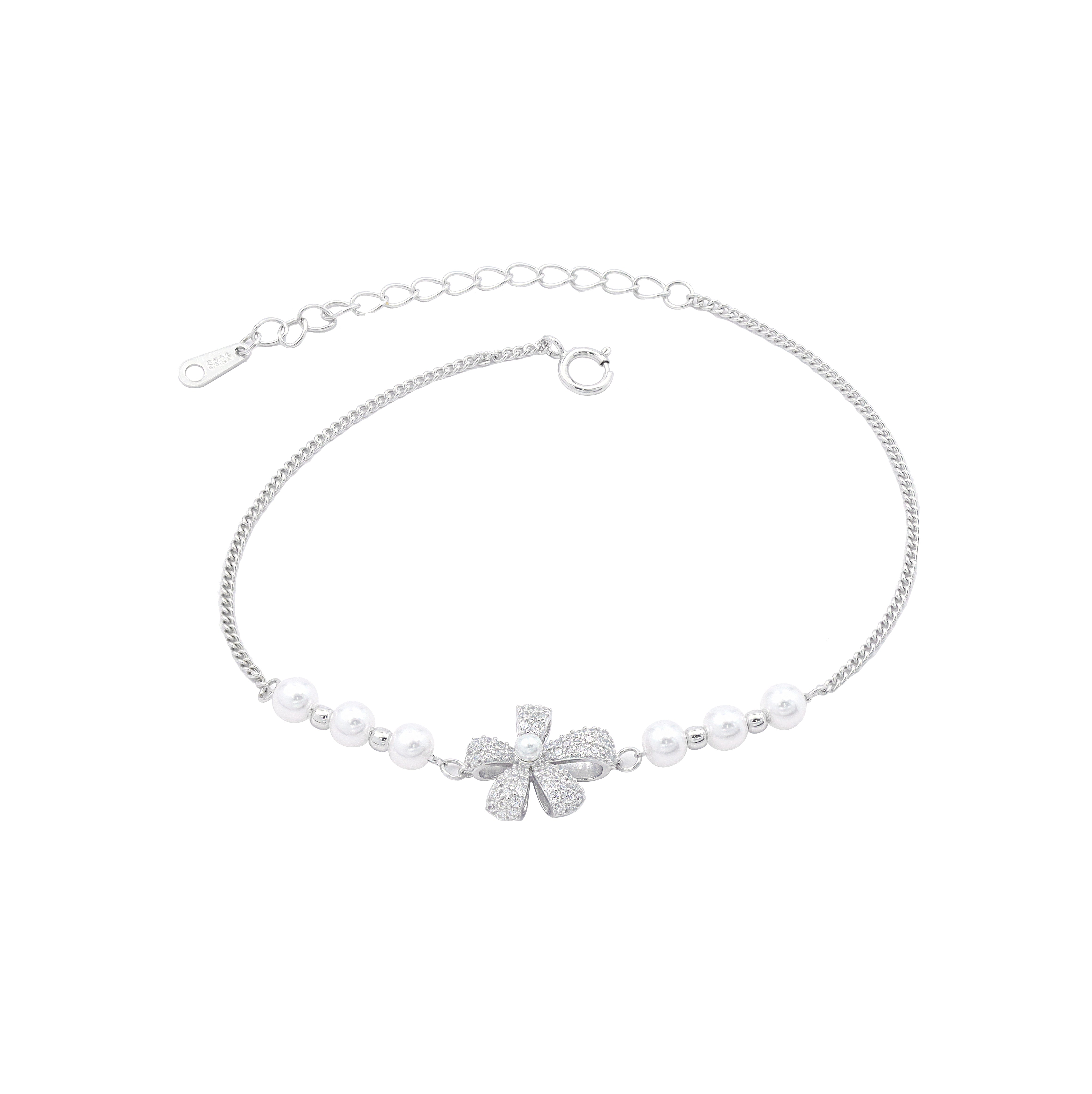 Order now and get delivery betweenGrace meets glamour in this Pearl & Bow 92.5 Sterling Silver Bracelet by Eri Silvers. This elegant bracelet features a radiant bow design adorned with shimmering cubic zirconia stones and surrounded by lustrous pearls, symbolizing femininity and sophistication.