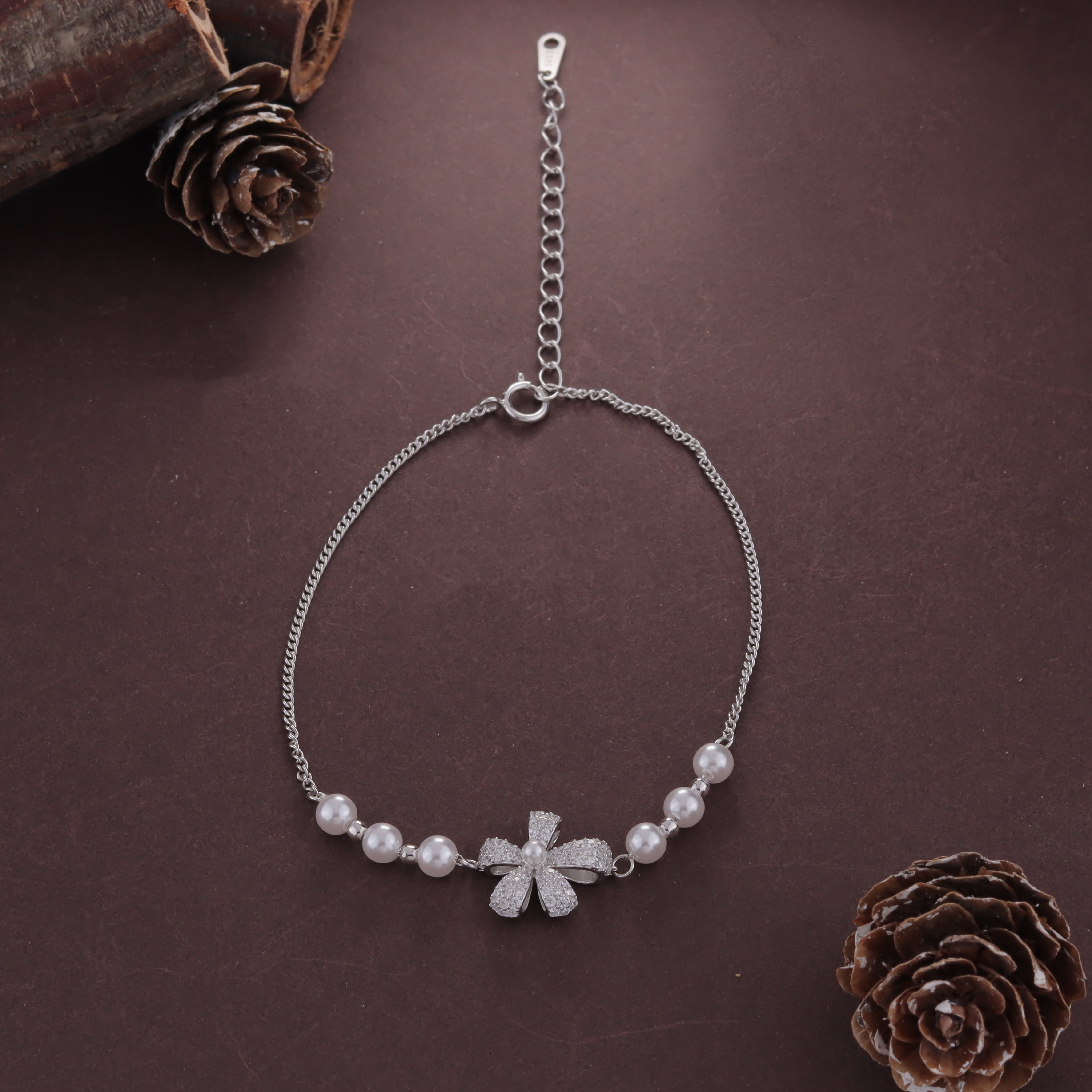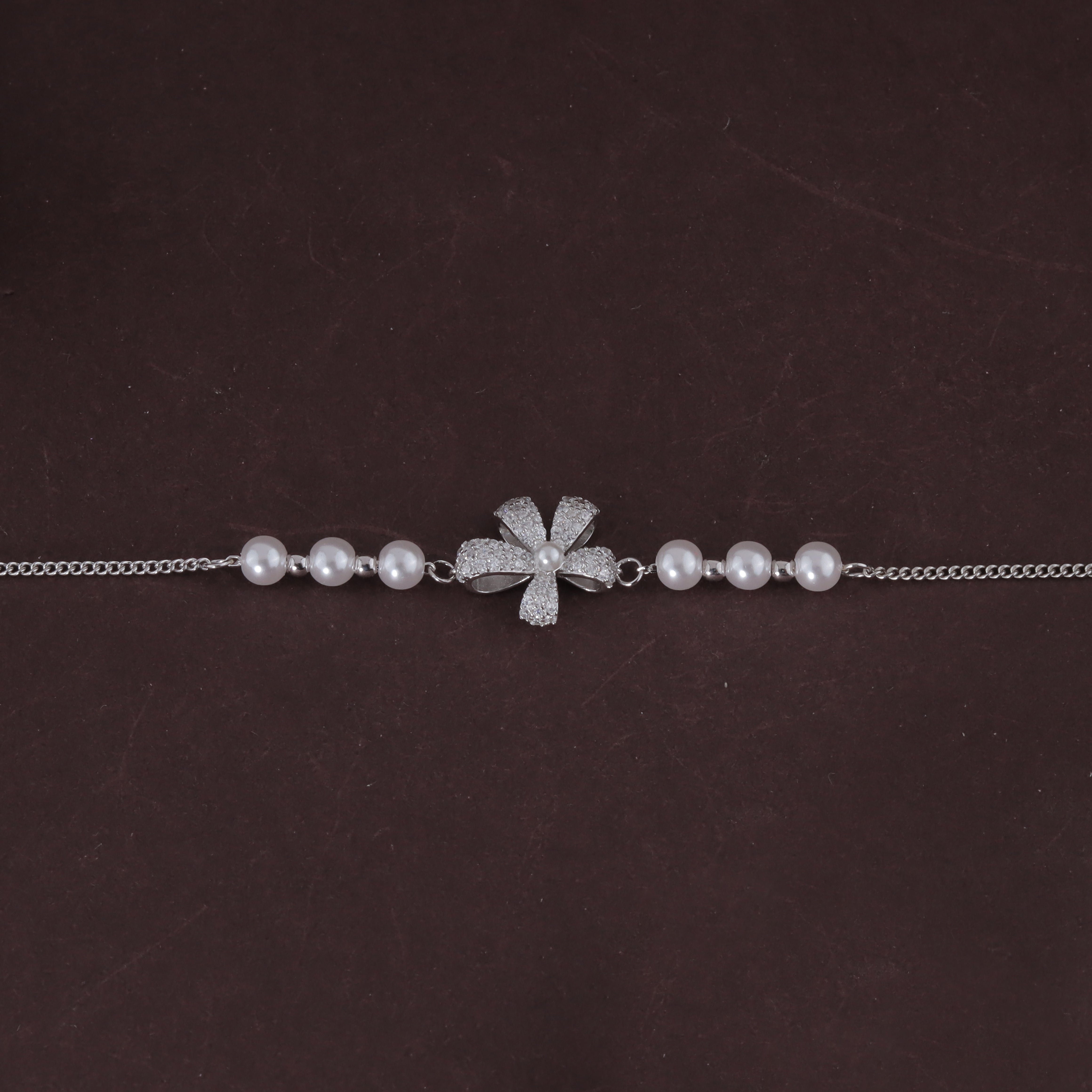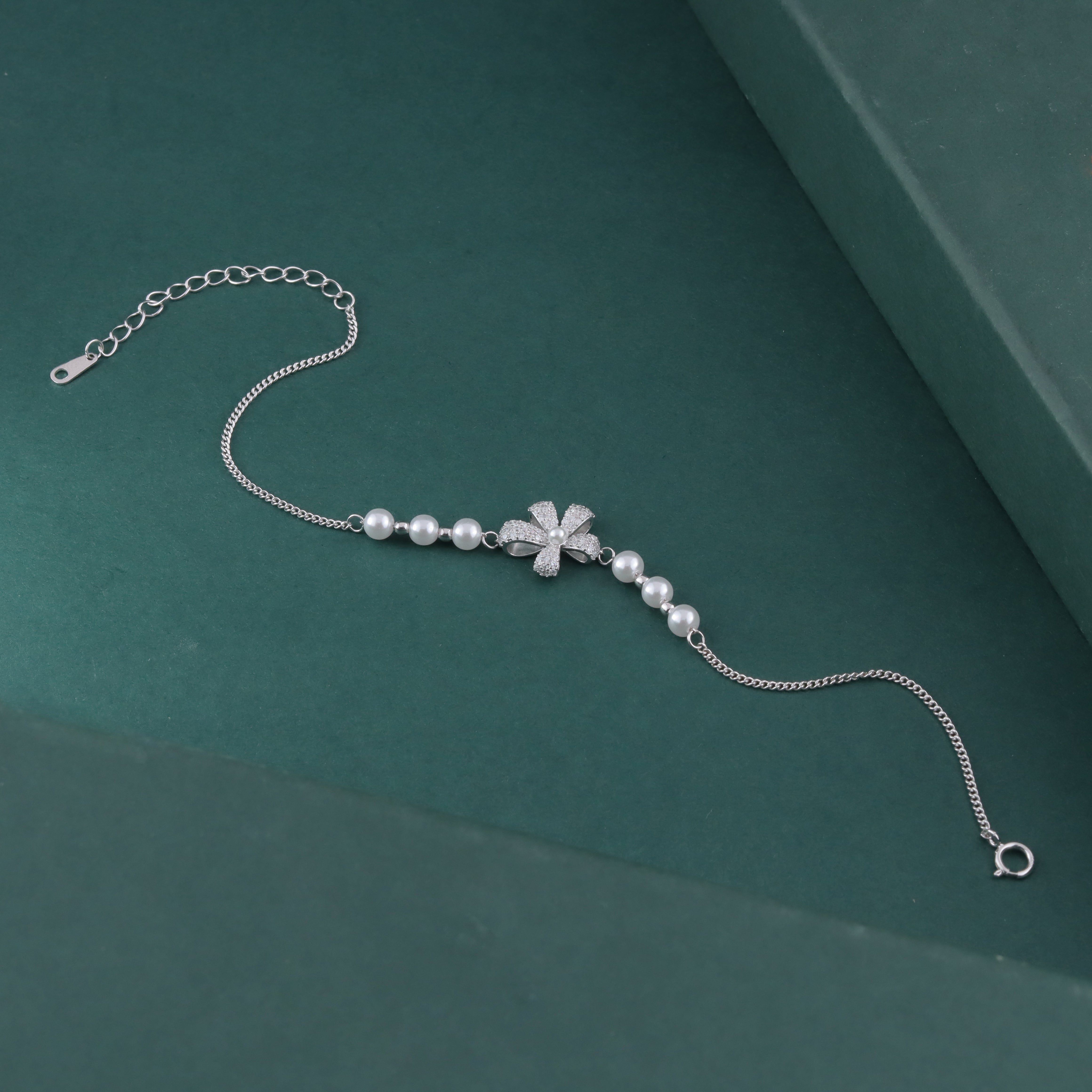 Grace meets glamour in this Pearl & Bow 92.5 Sterling Silver Bracelet by Eri Silvers. This elegant bracelet features a radiant bow design adorned with shimmering cubic zirconia stones and surrounded by lustrous pearls, symbolizing femininity and sophistication.
