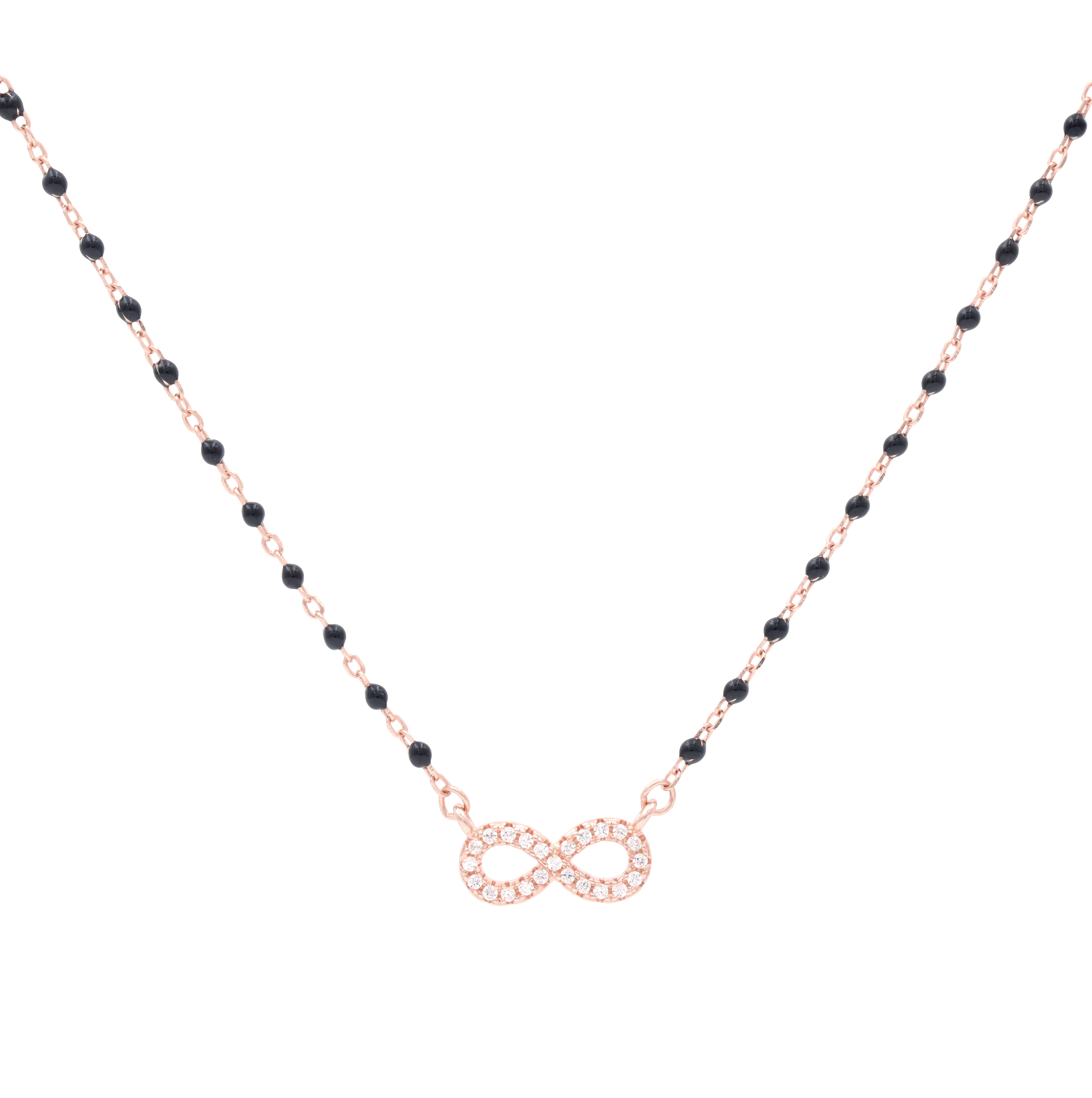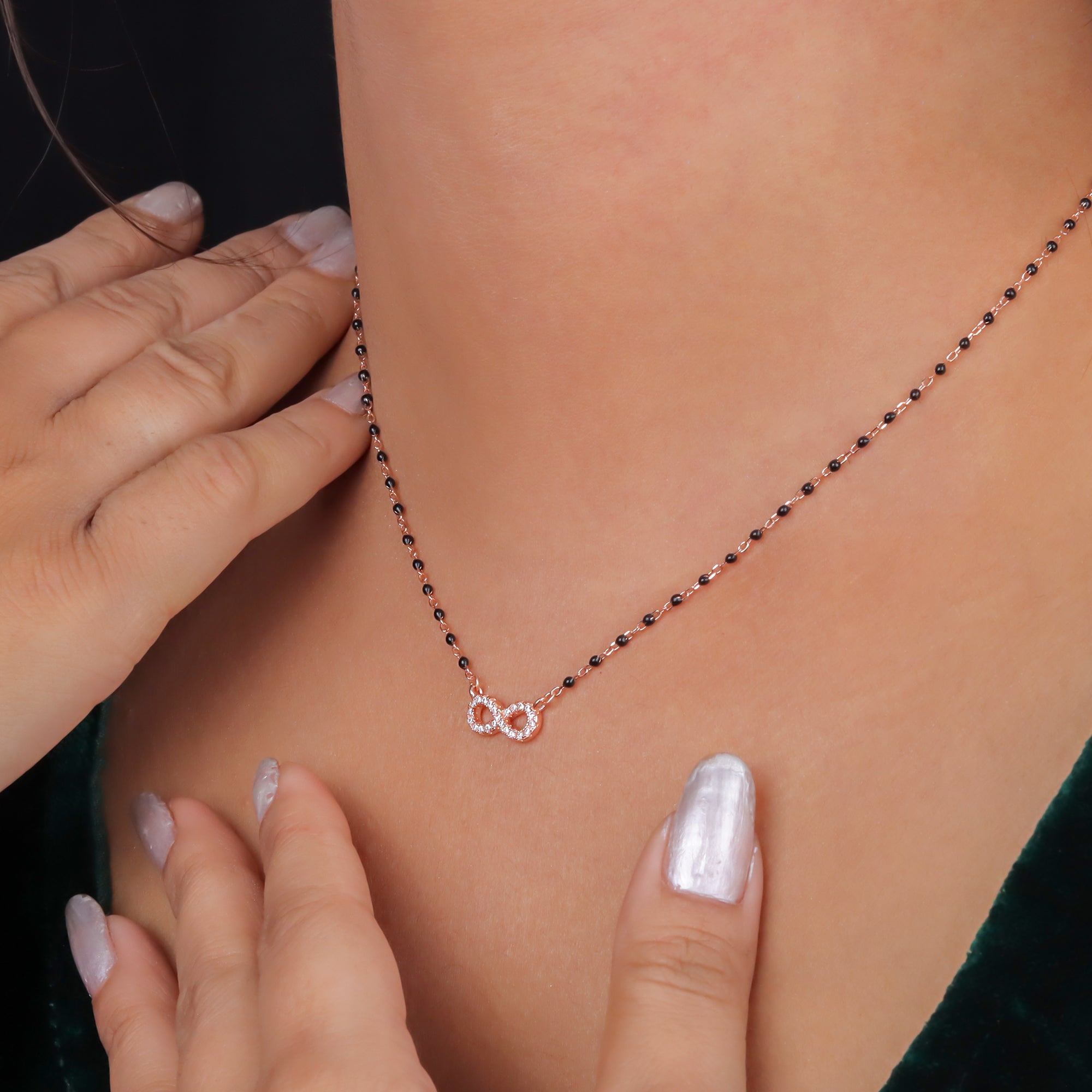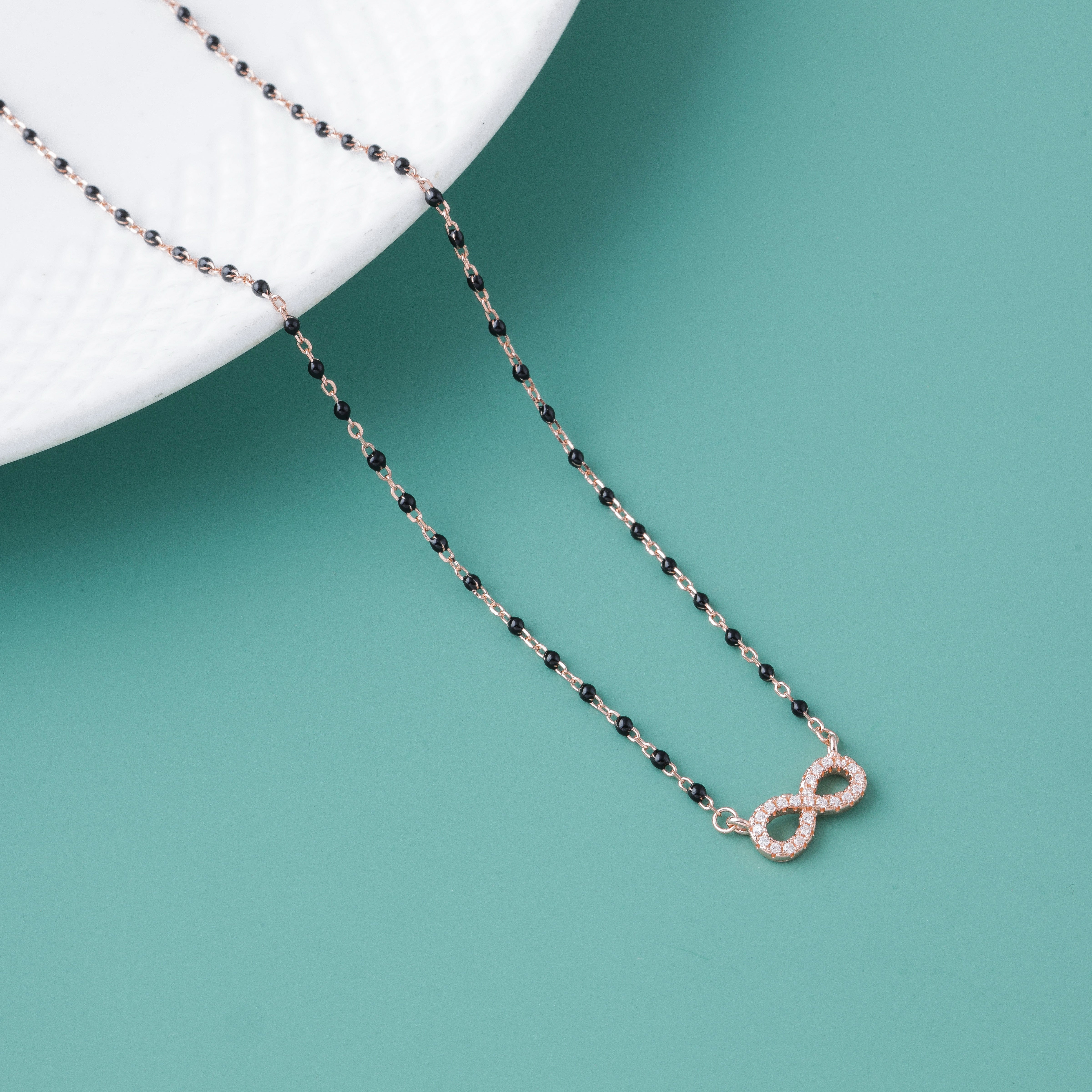 Crafted from 92.5% BIS-certified sterling silver, this elegant design features a rose gold finish and a CZ diamond-studded infinity pendant, symbolizing endless love and togetherness. The dual-tone black bead chain brings traditional grace with a modern twist — making it perfect for today’s women who adore both style and meaning.