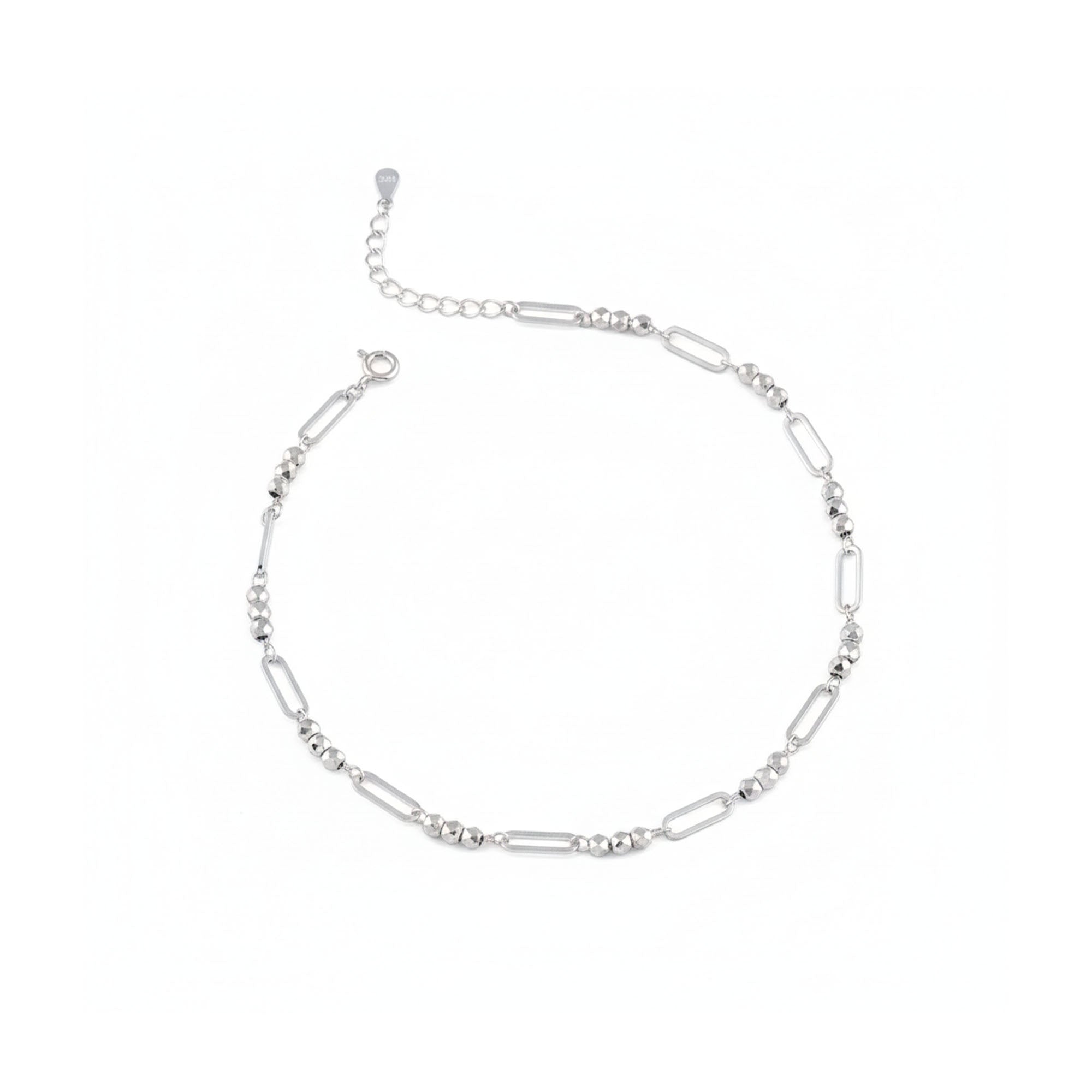 Designed with alternating long oval links and high-polish faceted beads, this anklet offers a striking balance between minimalism and luxury.