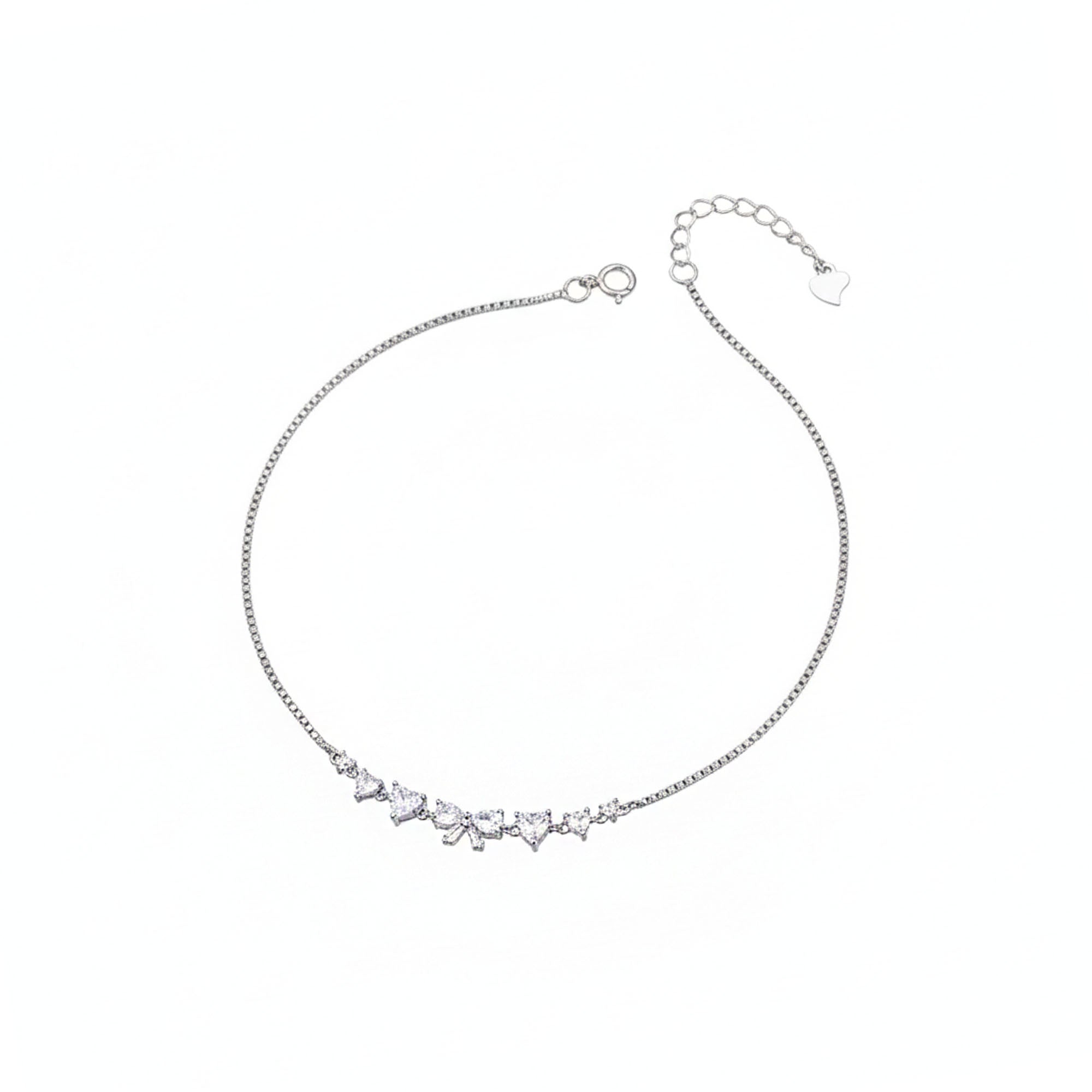 This charming piece features a graceful arrangement of butterfly and heart-shaped cubic zirconia charms, delicately set on a sleek box chain for a luxurious, polished finish.