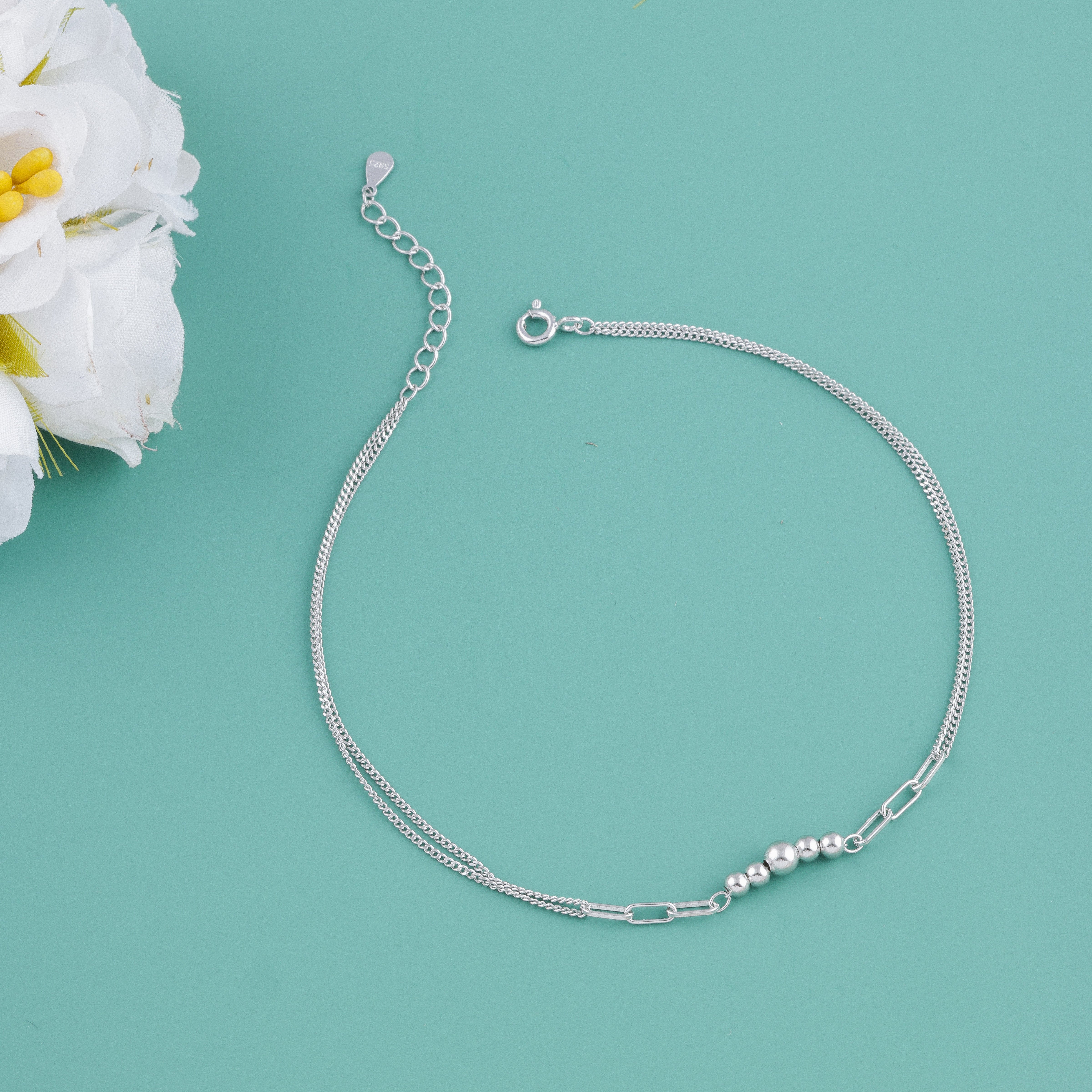 This anklet showcases a fine dual-link chain with polished silver beads at the center, offering a contemporary twist to traditional silver jewelry.