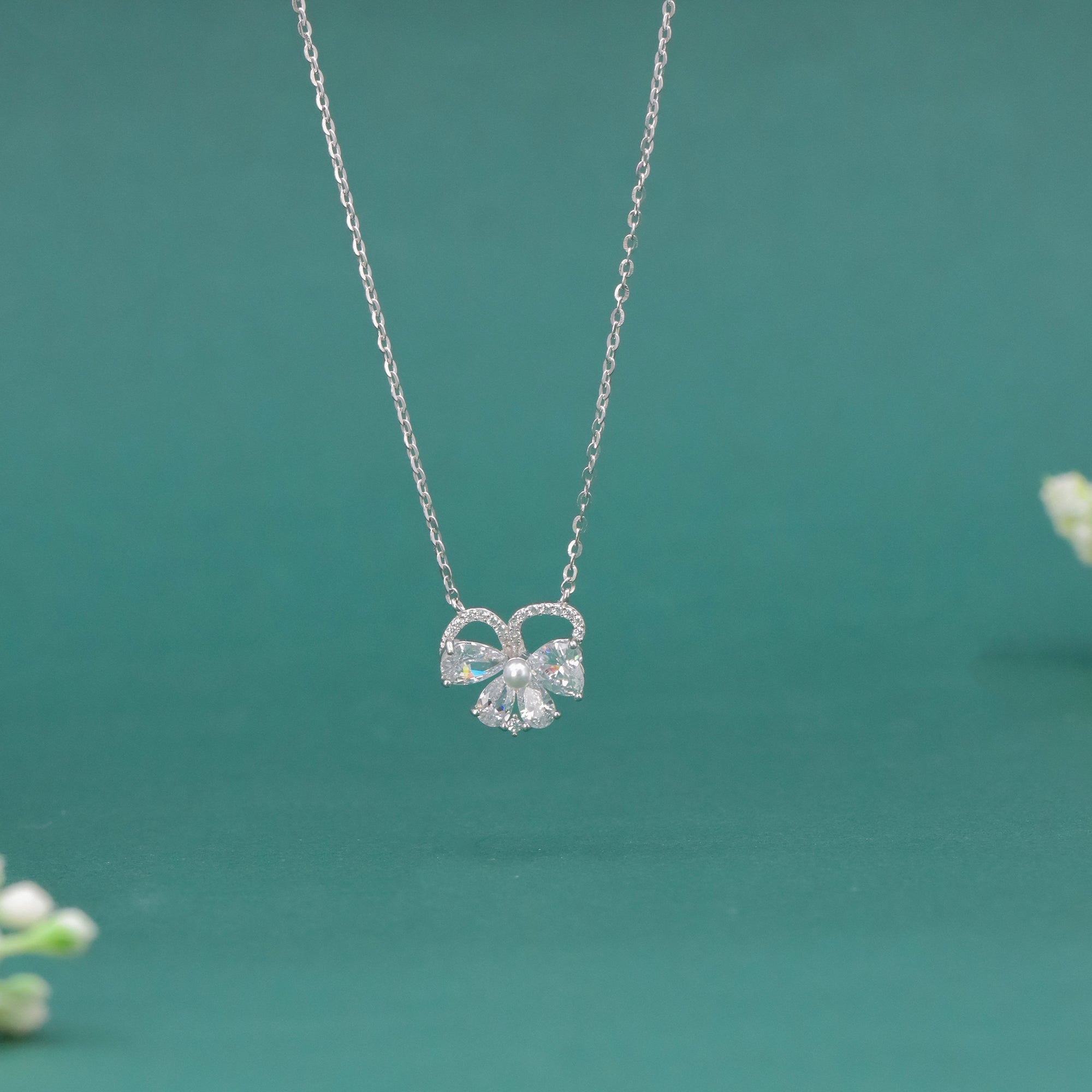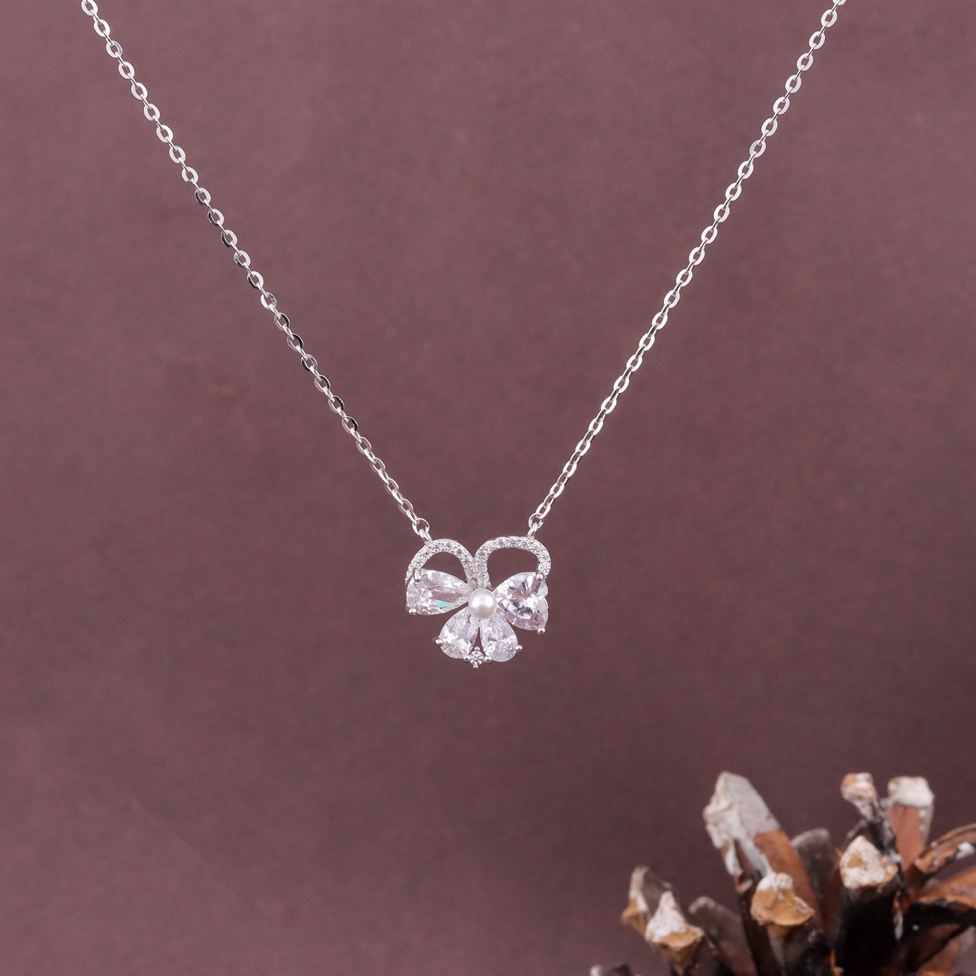 This enchanting pendant features a delicate flower-shaped design crafted in BIS Hallmarked 925 Sterling Silver, highlighted with AAA+ Grade Cubic Zirconia diamonds and a lustrous center pearl.