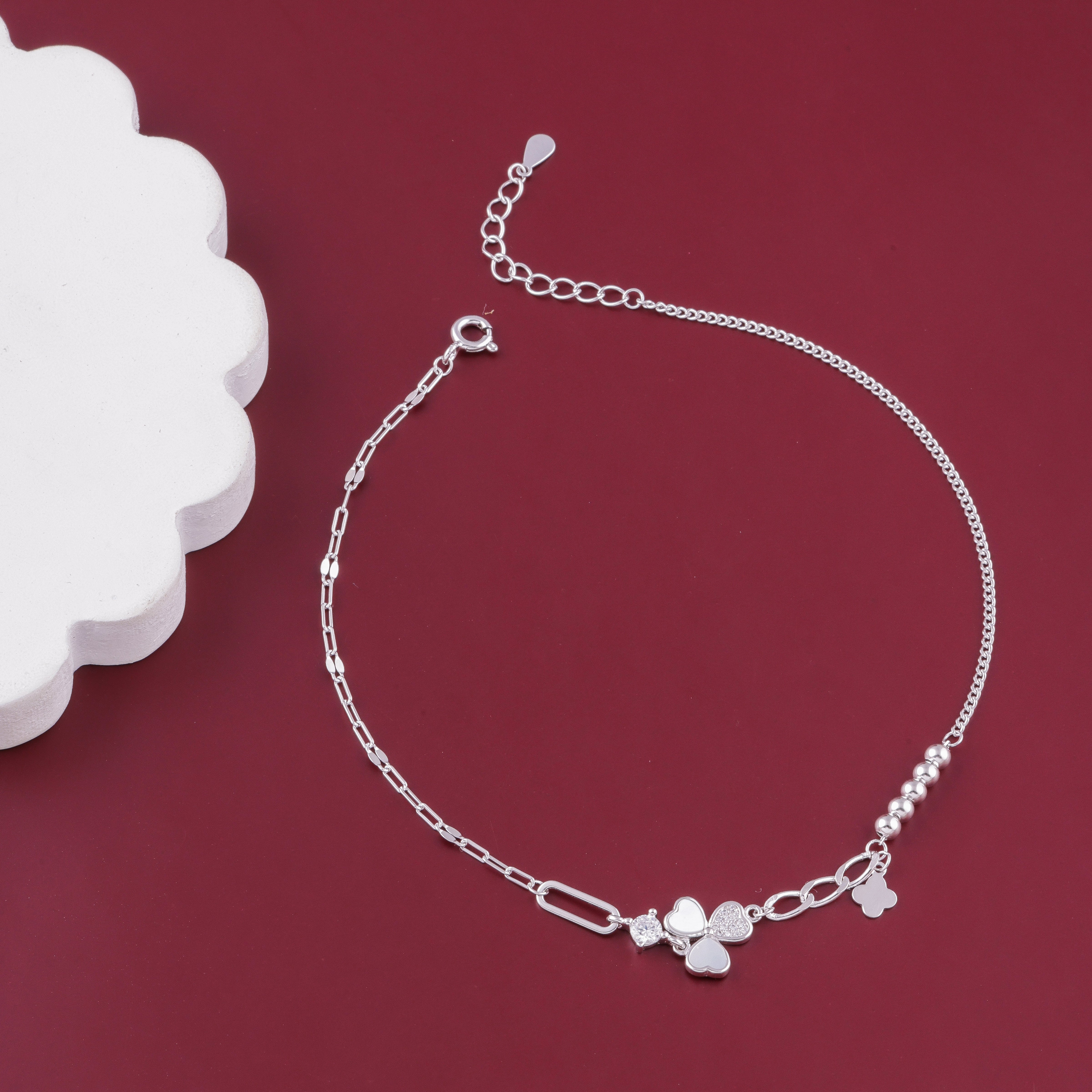 Featuring a triple-heart clover charm paired with polished silver beads and a unique dual-link chain design, this anklet blends minimalism with modern sophistication.