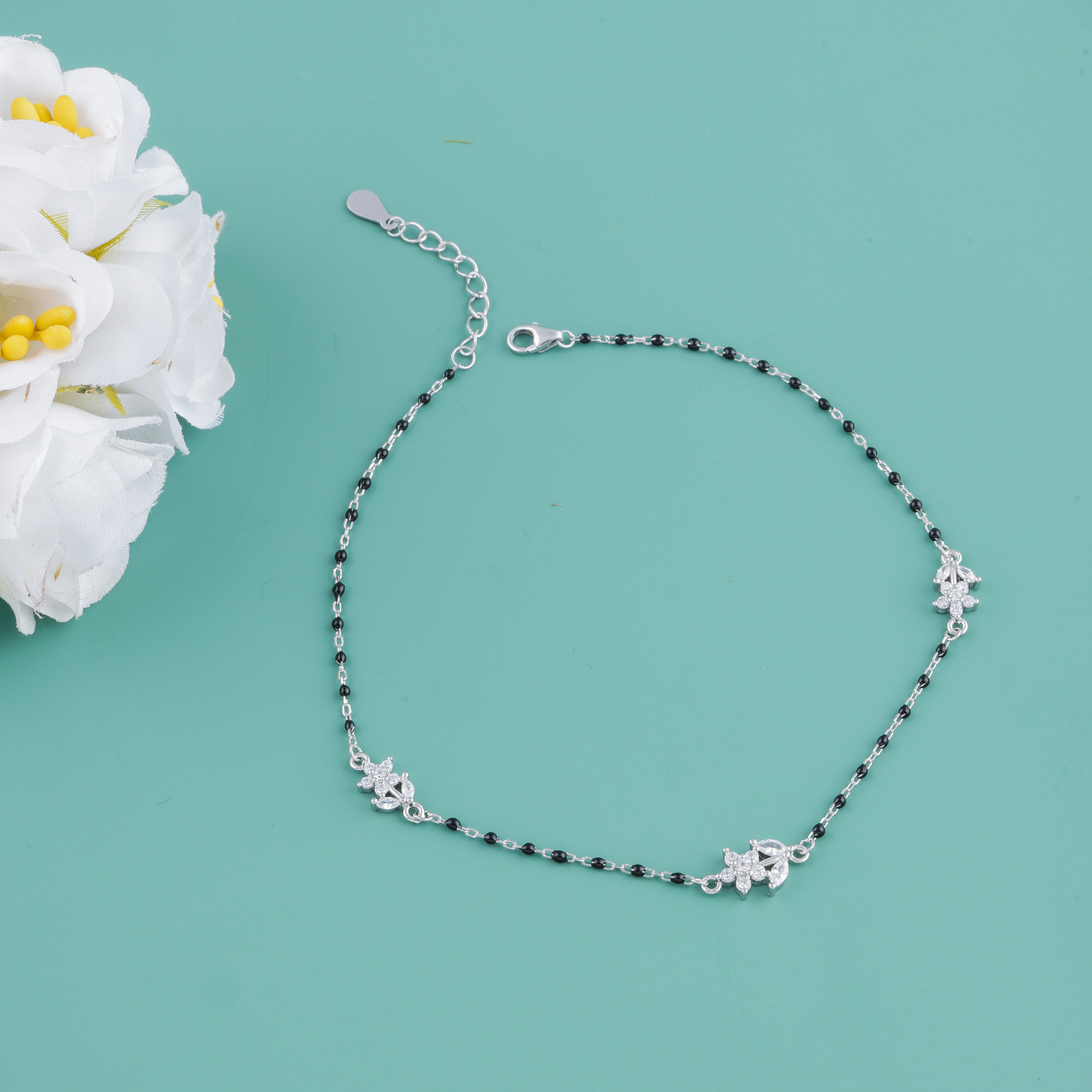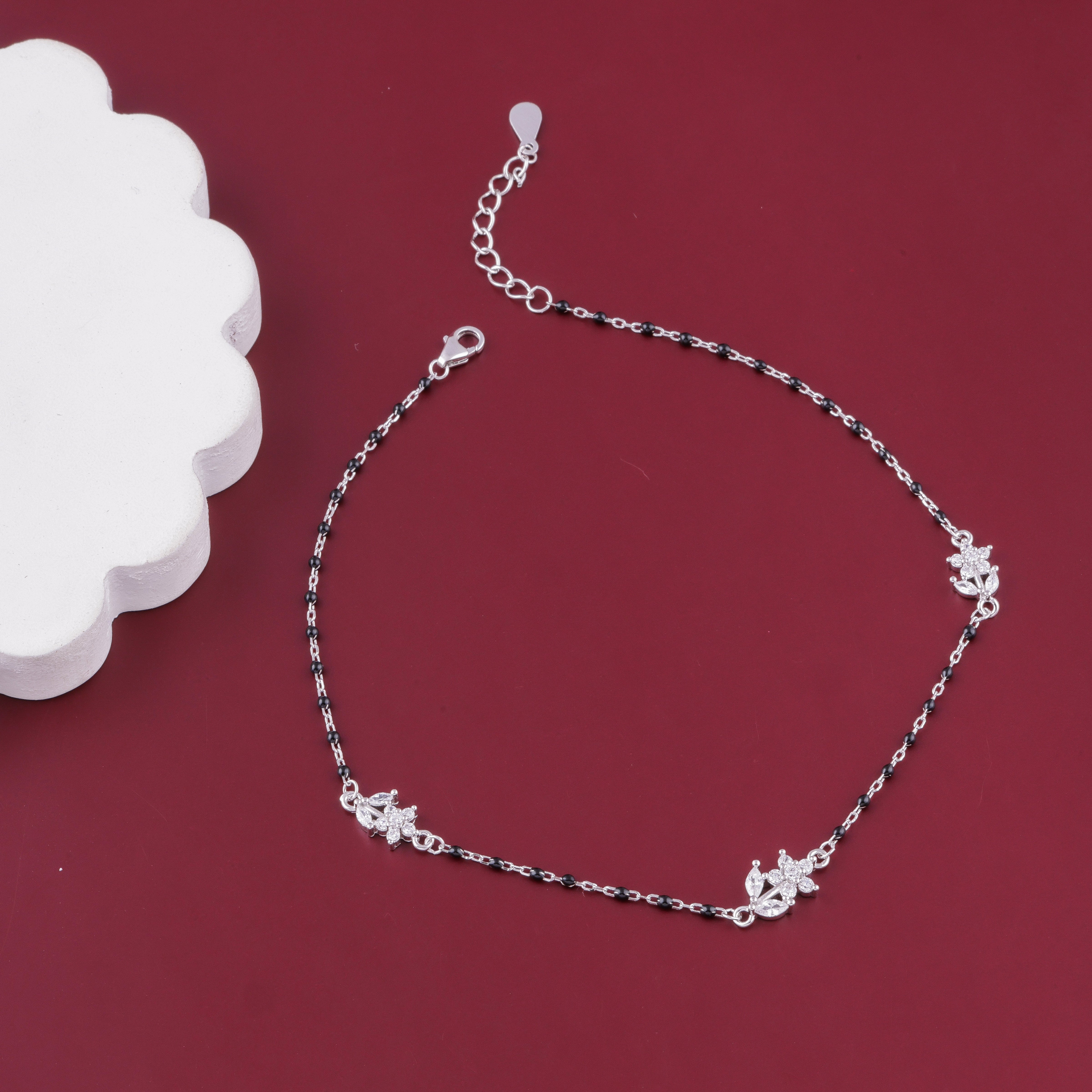 Handcrafted in BIS-hallmarked 925 Sterling Silver, this anklet features a sleek dual-tone chain with delicate black beads and sparkling CZ leaf charms, representing purity, grace, and strength.