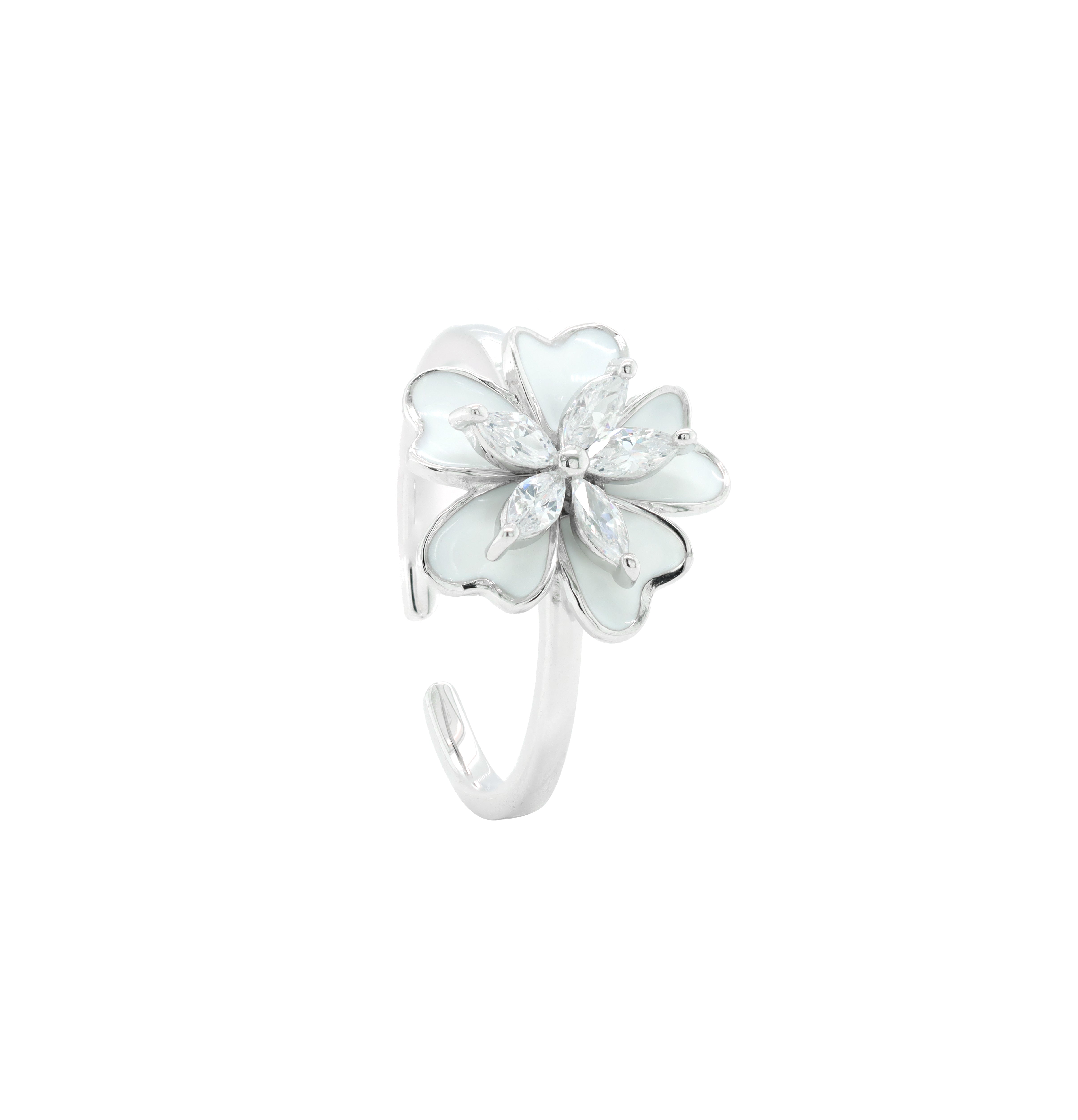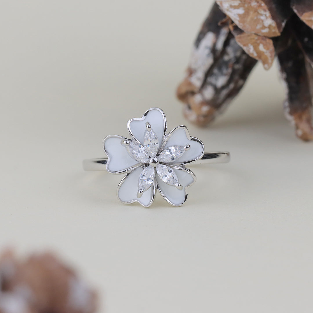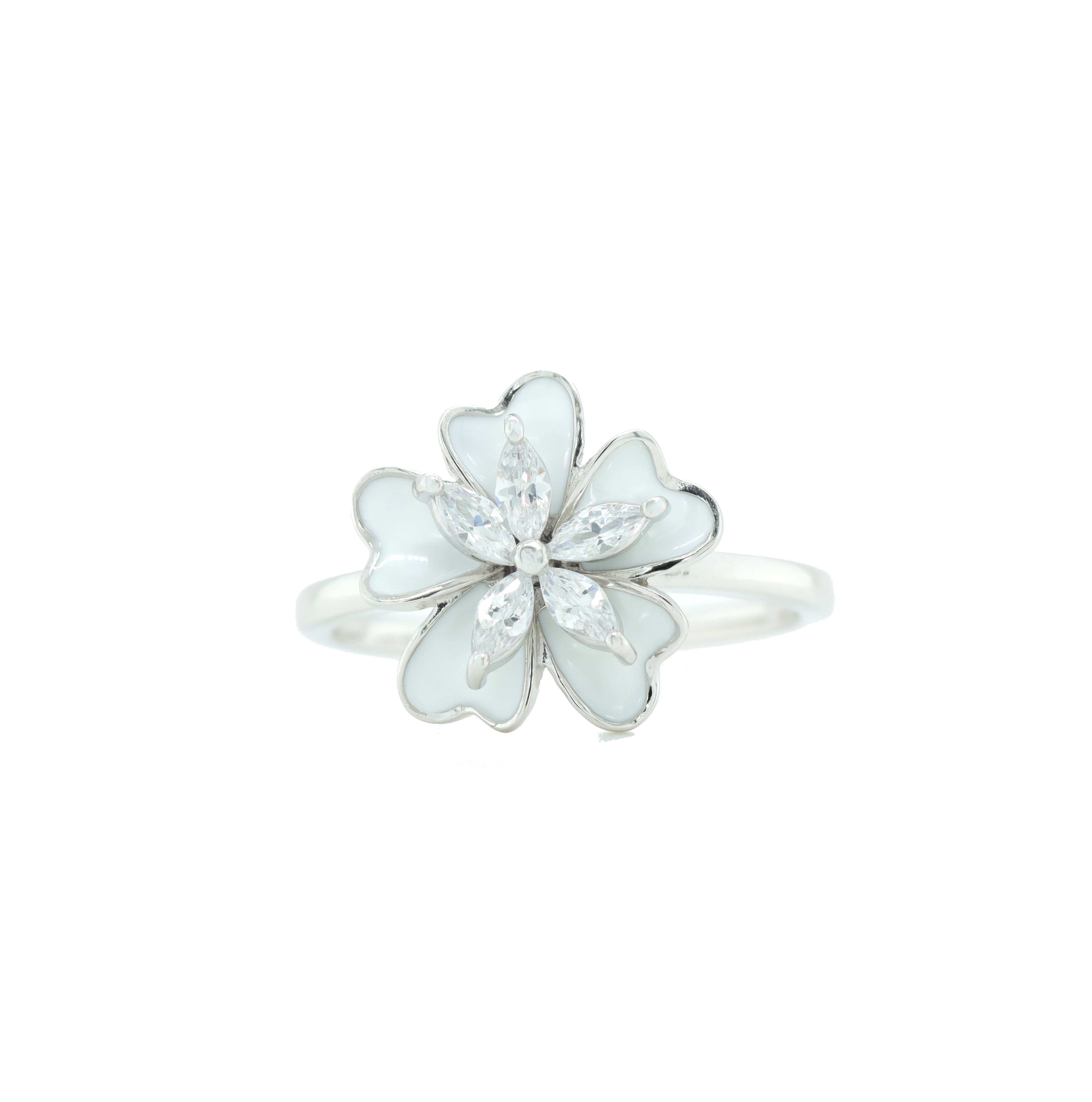 This exquisite ring showcases a six-petal flower design, featuring white enamel petals accented with marquise-cut CZ stones at the center, symbolizing purity and elegance.